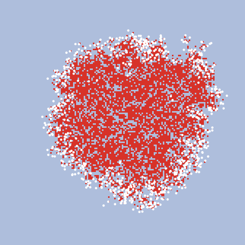 globals [traps-triggered] ;; how many traps have been sprung? to setup clear-all set traps-triggered 0 ;; an untriggered mousetrap is light blue ask patches [ set pcolor blue + 3 ] set-default-shape turtles "circle" ;; make the first ball crt 1 [ set color white set size 1.5 ] ;; easier to see reset-ticks end to go if not any? turtles [ stop ] ask turtles [ ;; if we hit the wall or land on a triggered mousetrap, ;; then stop ifelse pcolor = red [ die ] ;; triggered traps are red [ set pcolor red set traps-triggered traps-triggered + 1 ;; send another ball flying off hatch 1 [ move ] ;; also bounce ourselves move ] ] tick end to move ;; turtle procedure rt random-float 360 fd random-float max-distance end ; Copyright 2002 Uri Wilensky. ; See Info tab for full copyright and license.
