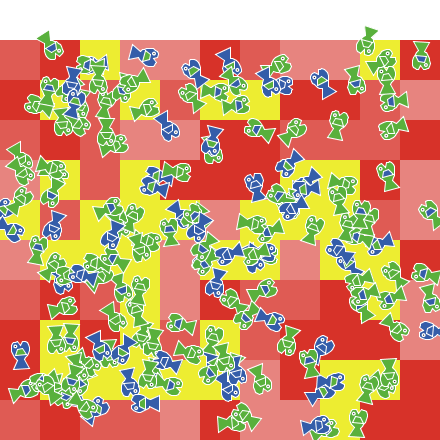 Fish vary by body and fin color, each of which can be either green or blue, so there are four different phenotypes. Underlying this variation are dominant and recessive genes, expressed in "4-blocks." A 4-block is a 2-by-2 array of squares, each of which can be either green or blue. Initially, fish are randomly distributed by 4-block genotype. Then, fish seek mates and reproduce, and the genetic distribution changes.
