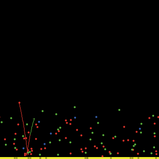 globals [ tick-delta ;; how much we advance the tick counter this time through max-tick-delta ;; the largest tick-delta is allowed to be avg-speed-init avg-energy-init ;; initial averages avg-speed avg-energy ;; current averages fast medium slow lost-particles ;; current counts percent-medium percent-slow ;; percentage of current counts percent-fast percent-lost-particles ;; percentage of current counts tracer ] breed [ particles particle ] breed [ flashes flash ] flashes-own [birthday] particles-own [ speed mass energy ;; particle info last-collision ] to setup clear-all set-default-shape particles "circle" set-default-shape flashes "plane" set max-tick-delta 0.1073 ;; make floor ask patches with [ pycor = min-pycor ] [ set pcolor yellow ] make-particles update-variables set avg-speed-init avg-speed set avg-energy-init avg-energy reset-ticks set tracer one-of turtles end to go ask particles [ bounce ] ask particles [ move ] if not any? particles [stop] ;; particles can die when they float too high ask particles [ if collide? [check-for-collision] ] if tracer = nobody [ set tracer one-of turtles ] ifelse trace? [ ask tracer [ pen-down ] ] [ ask tracer [ pen-up ] ] tick-advance tick-delta if floor ticks > floor (ticks - tick-delta) [ update-variables update-plots ] calculate-tick-delta ask flashes with [ticks - birthday > 0.4] [ die ] display end to update-variables set lost-particles (number-of-particles - count particles) set percent-lost-particles (lost-particles / number-of-particles) * 100 set medium count particles with [color = green] set slow count particles with [color = blue] set fast count particles with [color = red] set percent-medium (medium / (number-of-particles - lost-particles)) * 100 set percent-slow (slow / (number-of-particles - lost-particles)) * 100 set percent-fast (fast / (number-of-particles - lost-particles)) * 100 set avg-speed mean [speed] of particles set avg-energy mean [energy] of particles end to calculate-tick-delta ;; tick-delta is calculated in such way that even the fastest ;; particle will jump at most 1 patch length in a tick. As ;; particles jump (speed * tick-delta) at every tick, making ;; tick length the inverse of the speed of the fastest particle ;; (1/max speed) assures that. Having each particle advance at most ;; one patch-length is necessary for it not to "jump over" a wall ;; or another particle. ifelse any? particles with [speed > 0] [ set tick-delta min list (1 / (ceiling max [speed] of particles)) max-tick-delta ] [ set tick-delta max-tick-delta ] end to bounce ;; particle procedure ;; get the coordinates of the patch we'll be on if we go forward 1 let new-patch patch-ahead 1 ;; if we're not about to hit a wall, we don't need to do any further checks if new-patch = nobody or [pcolor] of new-patch != yellow [ stop ] let new-px [pxcor] of new-patch let new-py [pycor] of new-patch ;; if hitting the bottom, reflect heading around y axis if (new-py = min-pycor ) [ set heading (180 - heading)] ask patch new-px new-py [ sprout-flashes 1 [ set color pcolor - 2 set birthday ticks set heading 0 ] ] end to move ;; particle procedure ;; In other GasLab models, we use "jump speed * tick-delta" to move the ;; turtle the right distance along its current heading. In this ;; model, though, the particles are affected by gravity as well, so we ;; need to offset the turtle vertically by an additional amount. The ;; easiest way to do this is to use "setxy" instead of "jump". ;; Trigonometry tells us that "jump speed * tick-delta" is equivalent to: ;; setxy (xcor + dx * speed * tick-delta) ;; (ycor + dy * speed * tick-delta) ;; so to take gravity into account we just need to alter ycor ;; by an additional amount given by the classical physics equation: ;; y(t) = 0.5*a*t^2 + v*t + y(t-1) ;; but taking tick-delta into account, since tick-delta is a multiplier of t. let xdiff dx * speed * tick-delta let ydiff dy * speed * tick-delta - gravity-acceleration * (0.5 * (tick-delta ^ 2)) if patch-at xdiff ydiff = nobody [ die ] setxy (xcor + xdiff) (ycor + ydiff) factor-gravity end to factor-gravity ;; turtle procedure let vx (dx * speed) let vy (dy * speed) - (gravity-acceleration * tick-delta) set speed sqrt ((vy ^ 2) + (vx ^ 2)) recolor set heading atan vx vy end to check-for-collision ;; particle procedure ;; Here we impose a rule that collisions only take place when there ;; are exactly two particles per patch. if count other particles-here = 1 [ ;; the following conditions are imposed on collision candidates: ;; 1. they must have a lower who number than my own, because collision ;; code is asymmetrical: it must always happen from the point of view ;; of just one particle. ;; 2. they must not be the same particle that we last collided with on ;; this patch, so that we have a chance to leave the patch after we've ;; collided with someone. let candidate one-of other particles-here with [who < [who] of myself and myself != last-collision] ;; we also only collide if one of us has non-zero speed. It's useless ;; (and incorrect, actually) for two particles with zero speed to collide. if (candidate != nobody) and (speed > 0 or [speed] of candidate > 0) [ collide-with candidate set last-collision candidate ask candidate [ set last-collision myself ] ] ] end ;; implements a collision with another particle. ;; ;; THIS IS THE HEART OF THE PARTICLE SIMULATION, AND YOU ARE STRONGLY ADVISED ;; NOT TO CHANGE IT UNLESS YOU REALLY UNDERSTAND WHAT YOU'RE DOING! ;; ;; The two particles colliding are self and other-particle, and while the ;; collision is performed from the point of view of self, both particles are ;; modified to reflect its effects. This is somewhat complicated, so I'll ;; give a general outline here: ;; 1. Do initial setup, and determine the heading between particle centers ;; (call it theta). ;; 2. Convert the representation of the velocity of each particle from ;; speed/heading to a theta-based vector whose first component is the ;; particle's speed along theta,