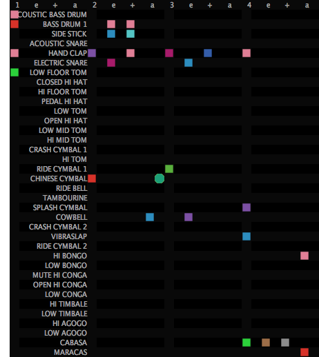 Colored squares represent drum hits. The world is a "map" of the composition in which time moves from left to right. Each row of patches is a particular drum, and each column represents a moment in time.