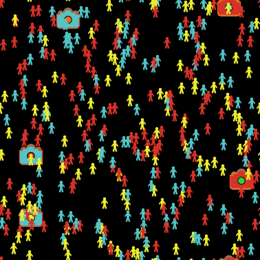 Students act as restaurant owners. Each student is given one restaurant to control and starts with 2000 dollars in his/her account. There are computer-controlled consumers that move around and may choose to become customers in restaurants of their choice. Their color shows which food they like. For instance, a red client likes food that can be found in the red restaurants ('American' cuisine).