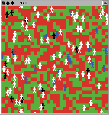 globals [endowment] ; The Patch represents a previous endowment which simulates the market dynamics, with the ; possibility of getting profits as the storeowners interact. breed [mafious a-mafious] breed [cops a-cop] breed [storeowners a-storeowner] turtles-own [money] patches-own [countdown] to setup clear-all ask patches [set pcolor green] if endowment? [ask patches [ set countdown random-exponential 360 endowment-return ; Definition of the countdown of the patches set pcolor one-of [green red] ; Randomize the pcolor with the term "one-of" ] ] set-default-shape mafious "mafious" ; In the turtle shape editor we have defined a shape called mafious create-mafious initial-number-mafious ; Lets us adjust the initial number of mafious by a slider [ set color black set size 2 set money initial-money-mafious ; Nå som slider setxy random-xcor random-ycor ; En reporter ] set-default-shape cops "cops" create-cops initial-number-cops [ set color blue set size 2 set money initial-money-cops setxy random-xcor random-ycor ] set-default-shape storeowners "storeowner" create-storeowners initial-number-storeowner [ set color white set size 2 set money initial-money-storeowners setxy random-xcor random-ycor] set endowment count patches with [pcolor = green] ; Endowment er generert profitt som simulerer tidligere markedsdynamikk og som representerer profitt. reset-ticks ; Fargen på disse feltene er grønn. Når en storeowner genererer profitt vil patcen bli rød. end to go if not any? turtles [ stop ] ; Spørsmålstegn fordi det er en logisk variabel. stop er en Netlogo commando. ask storeowners [ take-money multiply-storeowner ; reproduce the storeowners turtles, as they get profits. move death ] ask mafious [ move catch-storeowners ; the mafious asks for the pizo to a storeowner. En storeowner spør etter en sum penger av storeowners. death ; Gevinst er bedre ] ask cops [ move catch-mafious ; the cop ask a bribe for don't arrest the mafious. ] if endowment? [ ask patches [ endowment-return ] ] set endowment count patches with [pcolor = green] tick end to move rt random 50 lt random 50 fd 1 end to take-money if pcolor = green [ set pcolor red set money money + 5 ] end to catch-storeowners let mafia-power sum ([money] of mafious in-radius 20) / 100 ; We define the local variable mafia-power: the more rich the mafious are in a radius of 10, the bigger its influence ; is in that area. let ProbRefuse-myself sum ([money] of cops in-radius 20) / 100 ; Vi definerer Probrefuse-myself som tilhører storeowners som en funksjon som er avhengig av politiets ressurser ; i nærheten. (Radius 10). Sannsynligheten for å betale mafiaen penger. let prey one-of storeowners-here if prey != nobody ; Hvis bytte(storeowner) er forskjellig fra ingen gjør følgende [ask prey [ifelse (((ProbRefuse-myself * ((storeowners-thrust-in-govs-ability-to-fight-mafia * police-power) / 2 ))) < mafia-power ) ; Storeowners(prey): Hvis summen av politiets ressurser i nærheten og ; (Probrefuse) sannsynligheten for å ikke betale mafiaen (Innstilt med slider) multiplisert med politiets-styrker (innstit med slider)/100 /1000 er mindre enn mafians ressurser ; som representerer inflytelse i det området (mafia-power) Hvis sant: prey(storeowner) betaler tre penger til mafian. Gevinst: Vekst i profitt i nærliggende område vil øke (endowment) ; Hvis falskt: Storeowner mister en pengeenhet som følge av mafiaens undertrykkelse. [set money money - 3 ask patches in-radius 5 [endowment-return]] [set money money - 1 ask patches in-radius 2 [stop endowment-return]]]] ifelse (((ProbRefuse-myself * ((storeowners-thrust-in-govs-ability-to-fight-mafia * police-power) / 2 ))) < mafia-power ) [set money money + 3] [set money money + 0] ; The mafious obtain 3 coins if the storeowner pays, and anything if the storeowner refuses to pay. The police-power variable end ; is a coefficient that can turns negative, in the case in wich the police helps the mafious. to catch-mafious let payment sum ([money] of mafious-here) ; Definerer payment som bestikkelsen en mafious må betale til en politi-agent. payment would be the bribe paid by the mafious to the cop turtle. let prey one-of mafious-here ; Byttet er nå en random mafia-agent if prey != nobody [ask prey [ifelse (storeowners-thrust-in-govs-ability-to-fight-mafia * police-power) / 2 > 0 [set money money - (((storeowners-thrust-in-govs-ability-to-fight-mafia * police-power) / 2 / 100) * payment)] [set money money + (((storeowners-thrust-in-govs-ability-to-fight-mafia * police-power) / 2 / 1000) * payment)]]] ; Hvis politiets makt er større enn null så vil en mafious betale politiet og avhengig av payment(bestikkelse) multiplisert med politiets innflytelse/100 ; Hvis politiets makt ikke er større enn null, i tilfellet hvis politiet samarbeider med mafiaen, ; så vil mafiaen få et friere spillerom av politiet, noe som vil øke mafiaens inflytelse og formue. ifelse (storeowners-thrust-in-govs-ability-to-fight-mafia * police-power) / 2 > 0 [set money money + ((storeowners-thrust-in-govs-ability-to-fight-mafia * police-power) / 2 / 100) * payment] [set money money + ((storeowners-thrust-in-govs-ability-to-fight-mafia * police-power) / 2 / 1000) * payment] ; If the police decides to go against the mafious, its bribe is bigger than ; if it decides to help the mafious in domaining the market. end to endowment-return ; Definerer veksten i profitt. Instilles ved hjelp av en slider. defines the regrowth of the patch of endowment. if pcolor = red [ ; Hvis patch er rød(Ikke noe profitt å hente) ifelse countdown <= 0 ; Hvis countdown er mindre eller lik null gjør fargen om til grønn (profitt) og sett nedtelling lik endowment-rate som justeres med slider. [set pcolor green set countdown endowment-rate ] ; endowment-rate is the control of the "growt" of profits in the market. Man kan instille hvor kjapt profitten skal endres. [set countdown countdown - 1 ] ; Hvis ikke countdown er mindre eller lik null, sett trekk ifra 