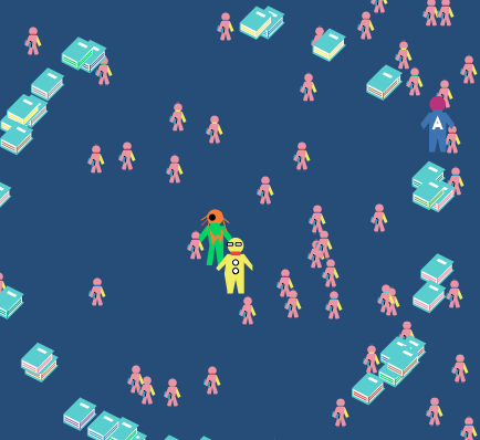 The student follow a set of simple rules. Each student starts wandering randomly. He can avoid to be catch by bad professor reading books and learning. With every step the student lose his energy - known in the simulation as knowledge. So he must read books in order to replenish the knowledge.