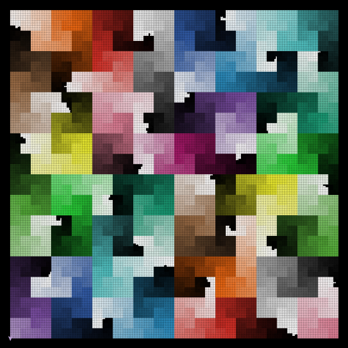 globals [ U ; up direction L ; left D ; down R ; right step ; width of each step of the trail agent waitsecs line-color ] to setup clear-all set U 0 set L 270 set D 180 set R 90 crt 1 [setxy (max-pxcor - 1) (min-pycor + 1) set heading D set agent self pen-down] set waitsecs exp (- degree) end ; setup to move [dir] ask agent [ set color (color + colorChangeRate) set heading dir fd step ] if slowly? [display wait waitsecs] end ; move to hilbert [level dir] ifelse level <= 1 [ if dir = L [move R move D move L] if dir = R [move L move U move R] if dir = U [move D move R move U] if dir = D [move U move L move D] ] [ if dir = L [ hilbert (level - 1) U move R hilbert (level - 1) L move D hilbert (level - 1) L move L hilbert (level - 1) D ] if dir = R [ hilbert (level - 1) D move L hilbert (level - 1) R move U hilbert (level - 1) R move R hilbert (level - 1) U ] if dir = U [ hilbert (level - 1) L move D hilbert (level - 1) U move R hilbert (level - 1) U move U hilbert (level - 1) R ] if dir = D [ hilbert (level - 1) R move U hilbert (level - 1) D move L hilbert (level - 1) D move D hilbert (level - 1) L ] ] end ; hilbert to go setup set step ((((max-pxcor - min-pxcor) / 2) - 1) / (2 ^ (degree - 1))) hilbert degree ([heading] of agent) end ; go
