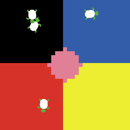 to setup clear-all ask patches[set pcolor green] ask patches with[pxcor < 0 and pycor > 0][set pcolor black] ask patches with[pxcor > -1 and pycor >= 0][set pcolor blue] ask patches with[pxcor < 0 and pycor < 1][set pcolor red] ask patches with[pxcor > -1 and pycor <= 0][set pcolor yellow] ask patch 0 0 [ask patches in-radius 4 [set pcolor pink]] create-turtles 4 ask turtles[setxy random-xcor random-ycor] ask turtles[set shape "turtle"] ask turtles[set size 4] ask turtles[set color white] ask turtles[set heading random-float 360] end to go ask turtles [forward 1] wait 0.5 ask turtles [if pcolor = pink [die]] ask turtles [if pcolor = blue [forward 5]] ask turtles [if pcolor = red [set shape "cow"]] ask turtles [if pcolor = yellow [wait 0.001]] ask turtles [pen-down] if not any? turtles [stop] ask turtles with [pcolor = black] [if random 100 <= 5 [hatch 1 [set shape "turtle" set size 2 setxy random-xcor random-ycor show "Turtle born!"]]] if random 100 <= 5 [ask n-of 2 patches with [pcolor = blue] [sprout 1 [set shape "cow" set size 2 set heading random 360 show "Cow born!"]]] end