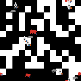 globals [gini-index-reserve lorenz-points ] breed [leaders] breed [opposers] breed [spoilers] patches-own [energy apathy] turtles-own [support] to setup clear-all setup-patches loyals protest ask turtles [set support support + 1] setup-leaders setup-opposers setup-spoilers update-lorenz-and-gini reset-ticks end to setup-patches ask patches [set pcolor green ] ask patches [set energy 0] ask patches [set apathy 0] end to loyals ask n-of кол.-лояльных-зон patches [ set pcolor yellow set apathy 1 ] end to protest ask n-of кол.-зон-недовольства patches [ set pcolor blue set energy 1 ] end to setup-spoilers create-spoilers количество-спойлеров ask spoilers [ setxy random-xcor random-ycor ] ask spoilers [set color grey] ask spoilers [set shape "mouse side"] end to setup-leaders create-leaders количество-лидеров ask leaders [ setxy random-xcor random-ycor ] ask leaders [set color red set size 1.2] ask leaders [set shape "bear"] ask leaders[set label-color blue - 1 ] ask turtle 0 [ifelse партия-власти? [set size 1.5 set support support + 2 watch-me] [set size 1.2 set support support + 1] ] end to setup-opposers create-opposers количество-претендентов ask opposers [ setxy random-xcor random-ycor ] ask opposers [set color white - 1] ask opposers [set shape "person business"] ask opposers [set label-color orange ] end to go if ticks = 450 [ stop] if ticks = 449 [ask patches [if pcolor = blue [ set pcolor white ] ]] ;; stop after 500 ticks if ticks = 449 [ask patches [if pcolor = yellow [ set pcolor black ] ]] ;; stop after 500 ticks if ticks = 449 [ask patches [if pcolor = green [ set pcolor white ] ]] ;; stop after 500 ticks move-leaders move-opposers move-spoilers ask leaders [compete] ask opposers [take-yours] ask opposers [retaliate] ask spoilers [spoil] update-lorenz-and-gini tick end to move-leaders ask leaders [ right random 360 forward 1 ask turtle 0 [ ifelse партия-власти? [forward 2] [forward 1]] ] end to move-opposers ask opposers [right random 360 forward 1] ask one-of opposers [ifelse кооперация-претендентов? [move-to one-of leaders forward 1] [right random 360 forward 1]] ask opposers [ifelse макс-конкурентность? [move-to one-of leaders forward 1] [right random 360 forward 1] ] end to move-spoilers ask spoilers [ifelse макс-конкурентность? or агрессия-спойлеров? [move-to one-of opposers forward 1] [right random 360 forward 1] ] end to spoil ask spoilers-here [if sum [count spoilers-here] of neighbors >= 2 and sum [count opposers-here] of neighbors = 1 [ help-leaders ]] end to compete ask leaders-here [if sum [count opposers-here] of neighbors < 2 and energy < 1 [ win-votes ] ] end to retaliate ask opposers-here [if sum [count opposers-here] of neighbors >= 1 and sum [count leaders-here] of neighbors < 2 and sum [count spoilers-here] of neighbors < 2 and apathy < 1[ persuade ]] end to take-yours ask opposers-here [if sum [count leaders-here] of neighbors < 1 and energy > 0 [persuade] ] end to win-votes ask leaders-here [if pcolor = green [ set pcolor black set support support + 1 ask turtle 0 [ ifelse партия-власти? [set support support + 0.5] [set support support + 0]]] if pcolor = yellow [ set pcolor black set support support + 1 ask turtle 0 [ ifelse партия-власти? [set support support + 1] [set support support + 0]]] if pcolor = white [ set pcolor black set support support + 1 ask turtle 0 [ ifelse партия-власти? [set support support + 0.5] [set support support + 0]]] ifelse показать-поддержку? [ set label support ] [ set label "" ] ] end to persuade ask opposers-here [ if pcolor = green [ set pcolor white set support support + 1] if pcolor = blue [ set pcolor white set support support + 1 ask turtle 1 [ ifelse ведущая-опп.-партия? [set support support + 1] [set support support + 0]]] if pcolor = black [ set pcolor white set support support + 1 ask turtle 1 [ ifelse ведущая-опп.-партия? [set support support + 0.5] [set support support + 0]]] ifelse показать-поддержку? [ set label support ] [ set label "" ] ] end to help-leaders ask spoilers-here [ if pcolor = green [ set pcolor black set support support + 0.5 ask turtle 0 [set support support + 1] ] if pcolor = blue[ set pcolor black set support support + 0.5 ask turtle 0 [set support support + 1]] if pcolor = white [ set pcolor black set support support + 0.5 ask turtle 0 [set support support + 1]] ] end to update-lorenz-and-gini let sorted-supports sort [support] of turtles let total-support sum sorted-supports let support-sum-so-far 0 let index 0 set gini-index-reserve 0 set lorenz-points [] repeat count turtles [ set support-sum-so-far (support-sum-so-far + item index sorted-supports) set lorenz-points lput ((support-sum-so-far / total-support) * 100) lorenz-points set index (index + 1) set gini-index-reserve gini-index-reserve + (index / count turtles) - (support-sum-so-far / total-support) ] end ;Иванов В.Г., РУДН, 2012 г.
