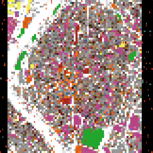 globals [ contadorTicks persout persdie personasdentro listatipos ] turtles-own [ feliz? felicidad-actual terciario esppublico cultivo produccion servicio vacio edificacion vida tipo] to setup ca set listatipos [ [3 5 4 0 2 0 2] [1 3 5 4 3 0 1] [2 3 4 4 4 0 3] [1 3 3 3 4 0 4] [2 4 3 1 3 0 4] [2 3 5 4 3 0 2] [2 3 4 4 4 0 3] [1 3 3 3 4 0 4] [2 4 3 1 5 0 4] [3 2 4 4 4 0 1] [2 3 4 4 4 0 3] [2 3 3 3 4 0 4] [1 3 3 1 5 0 4] [3 2 4 4 4 0 2] [3 3 4 4 4 0 3] [3 3 3 3 4 0 4] [2 3 3 1 5 0 4] [2 4 4 2 5 0 3] [3 4 4 2 5 0 4] [1 4 4 2 4 0 2] ] let colors [orange red green yellow magenta white] ;cultivo-verde, servicios-magenta, produccion-amarillo, terciario-naranja, esppublico-rojo vacio-blanco ; ask n-of diversidad-ext patches [ ; set pcolor one-of colors ; ] porcentaje-inicial color-patches crt round(%adolescencia * poblacion) / 100 [ setxy random-pxcor random-pycor set tipo 0; este número es el de los tipo de tortugas, no de patches. set terciario item 0 item tipo listatipos set esppublico item 1 item tipo listatipos set cultivo item 2 item tipo listatipos set produccion item 3 item tipo listatipos set servicio item 4 item tipo listatipos set vacio item 5 item tipo listatipos set edificacion item 6 item tipo listatipos set feliz? false set felicidad-actual 0 set vida 0 set shape "al_adolescente" ] crt round(%adulteztemprana * poblacion) / 100 [ setxy random-pxcor random-pycor set tipo 1; este número es el de los tipo de tortugas, no de patches. set terciario item 0 item tipo listatipos set esppublico item 1 item tipo listatipos set cultivo item 2 item tipo listatipos set produccion item 3 item tipo listatipos set servicio item 4 item tipo listatipos set vacio item 5 item tipo listatipos set edificacion item 6 item tipo listatipos set feliz? false set felicidad-actual 0 set vida 20 set shape "al_adultotemprana" ] crt round(%adulteztempranay1 * poblacion) / 100 [ setxy random-pxcor random-pycor set tipo 2; este número es el de los tipo de tortugas, no de patches. set terciario item 0 item tipo listatipos set esppublico item 1 item tipo listatipos set cultivo item 2 item tipo listatipos set produccion item 3 item tipo listatipos set servicio item 4 item tipo listatipos set vacio item 5 item tipo listatipos set edificacion item 6 item tipo listatipos set feliz? false set felicidad-actual 0 set vida 20 set shape "al_adultotempranay1" ] crt round(%adulteztempranay2 * poblacion) / 100 [ setxy random-pxcor random-pycor set tipo 3; este número es el de los tipo de tortugas, no de patches. set terciario item 0 item tipo listatipos set esppublico item 1 item tipo listatipos set cultivo item 2 item tipo listatipos set produccion item 3 item tipo listatipos set servicio item 4 item tipo listatipos set vacio item 5 item tipo listatipos set edificacion item 6 item tipo listatipos set feliz? false set felicidad-actual 0 set vida 20 set shape "al_adultotempranay2" ] crt round(%adulteztempranay3 * poblacion) / 100 [ setxy random-pxcor random-pycor set tipo 4; este número es el de los tipo de tortugas, no de patches. set terciario item 0 item tipo listatipos set esppublico item 1 item tipo listatipos set cultivo item 2 item tipo listatipos set produccion item 3 item tipo listatipos set servicio item 4 item tipo listatipos set vacio item 5 item tipo listatipos set edificacion item 6 item tipo listatipos set feliz? false set felicidad-actual 0 set vida 20 set shape "al_adultotempranay3" ] crt round(%adulteztempranap * poblacion) / 100 [ setxy random-pxcor random-pycor set tipo 5; este número es el de los tipo de tortugas, no de patches. set terciario item 0 item tipo listatipos set esppublico item 1 item tipo listatipos set cultivo item 2 item tipo listatipos set produccion item 3 item tipo listatipos set servicio item 4 item tipo listatipos set vacio item 5 item tipo listatipos set edificacion item 6 item tipo listatipos set feliz? false set felicidad-actual 0 set vida 20 set shape "al_adultotempranap" ] crt round(%adulteztempranapy1 * poblacion) / 100 [ setxy random-pxcor random-pycor set tipo 6; este número es el de los tipo de tortugas, no de patches. set terciario item 0 item tipo listatipos set esppublico item 1 item tipo listatipos set cultivo item 2 item tipo listatipos set produccion item 3 item tipo listatipos set servicio item 4 item tipo listatipos set vacio item 5 item tipo listatipos set edificacion item 6 item tipo listatipos set feliz? false set felicidad-actual 0 set vida 20 set shape "al_adultotempranapy1" ] crt round(%adulteztempranapy2 * poblacion) / 100 [ setxy random-pxcor random-pycor set tipo 7; este número es el de los tipo de tortugas, no de patches. set terciario item 0 item tipo listatipos set esppublico item 1 item tipo listatipos set cultivo item 2 item tipo listatipos set produccion item 3 item tipo listatipos set servicio item 4 item tipo listatipos set vacio item 5 item tipo listatipos set edificacion item 6 item tipo listatipos set feliz? false set felicidad-actual 0 set vida 20 set shape "al_adultotempranapy2" ] crt round(%adulteztempranapy3 * poblacion) / 100 [ setxy random-pxcor random-pycor set tipo 8; este número es el de los tipo de tortugas, no de patches. set terciario item 0 item tipo listatipos set esppublico item 1 item tipo listatipos set cultivo item 2 item tipo listatipos set produccion item 3 item tipo listatipos set servicio item 4 item tipo listatipos set vacio item 5 item tipo listatipos set edificacion item 6 item tipo listatipos set feliz? false set felicidad-actual 0 set vida 20 set shape "al_adultotempranapy3" ] crt round(%adultezmedia * poblacion) / 100 [ setxy random-pxcor random-pycor set tipo 9; este número es el de los tipo de tortugas, no de patches. set terciario item 0 item tipo listatipos set esppublico item 1 item tipo listatipos set cultivo item 2 item tipo listatipos set produccion item 3 item tipo listatipos set servicio item 4 item tipo listatipos set vacio item 5 item tipo listatipos set edificacion item 6 item tipo listatipos set feliz? f