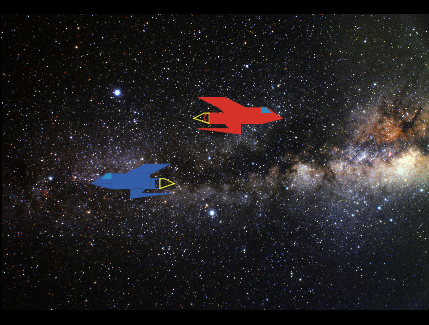 ;;Special Relativity Simulation ;;Defines Global variables Globals [gamma t rocket1-time rocket2-time rocket-size-%] ;;Sets the environment to setup clear-all imPort-drawing "space-09.jPg" setup-rockets set t 0 end ;;Creates the rockets breed [rocket1] breed [rocket2] to setup-rockets create-rocket1 1 set-default-shape turtles "rocket1" ask rocket1 [ set size (8) setxy 2 3 set color red set heading 90] create-rocket2 1 set-default-shape turtles "rocket2" ask rocket2 [ ;;Let 8 be the proper lenght of the object set size (8) setxy 2 -2 set color blue set heading 270] end ;;Makes the rockets go to go ask rocket1 [set heading 90] ask rocket2 [set heading 270 forward (RelativeSpeed ) ] ;;The relative speed input by the user is enter as a fraction of the speed of light. ;;Each tick the rockets moves 1 light year. ;;Sets Value for Gamma set gamma sqrt(1 - ( RelativeSpeed ^ 2 )) calculate-lenght-contraction calculate-time-dilatation set t (t + 1) end ;;Calculate the lenght depending on the relativistic speed to calculate-lenght-contraction ask rocket2 [set size ( 8 * gamma) set rocket-size-% (size / 8) * 100] ;;Note the Proper lenght of the object is 8 light years long. end ;;Calculates the time dilation of the object. to calculate-time-dilatation set rocket1-time (t) set rocket2-time ( (t) / gamma ) end ;;By Jose Vanir Valenzuela