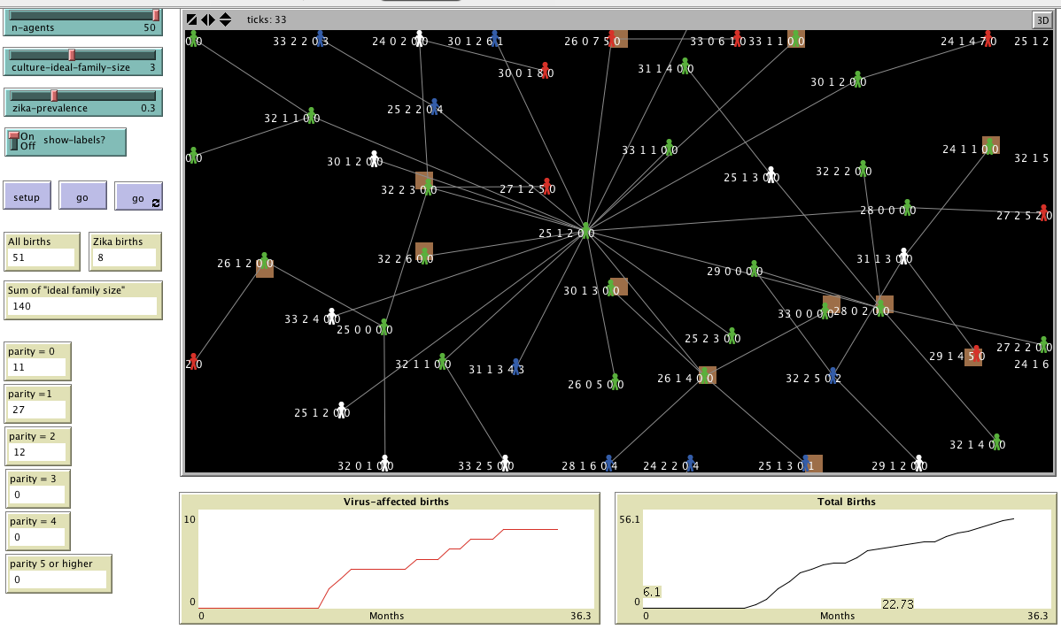 Before SETUP: n-agents slider sets the number of women. zika-prevalence slider sets the rate of viral infection. culture-ideal-family-size slider sets a norm, from which using a Poisson distribution each woman has an individualised target.
