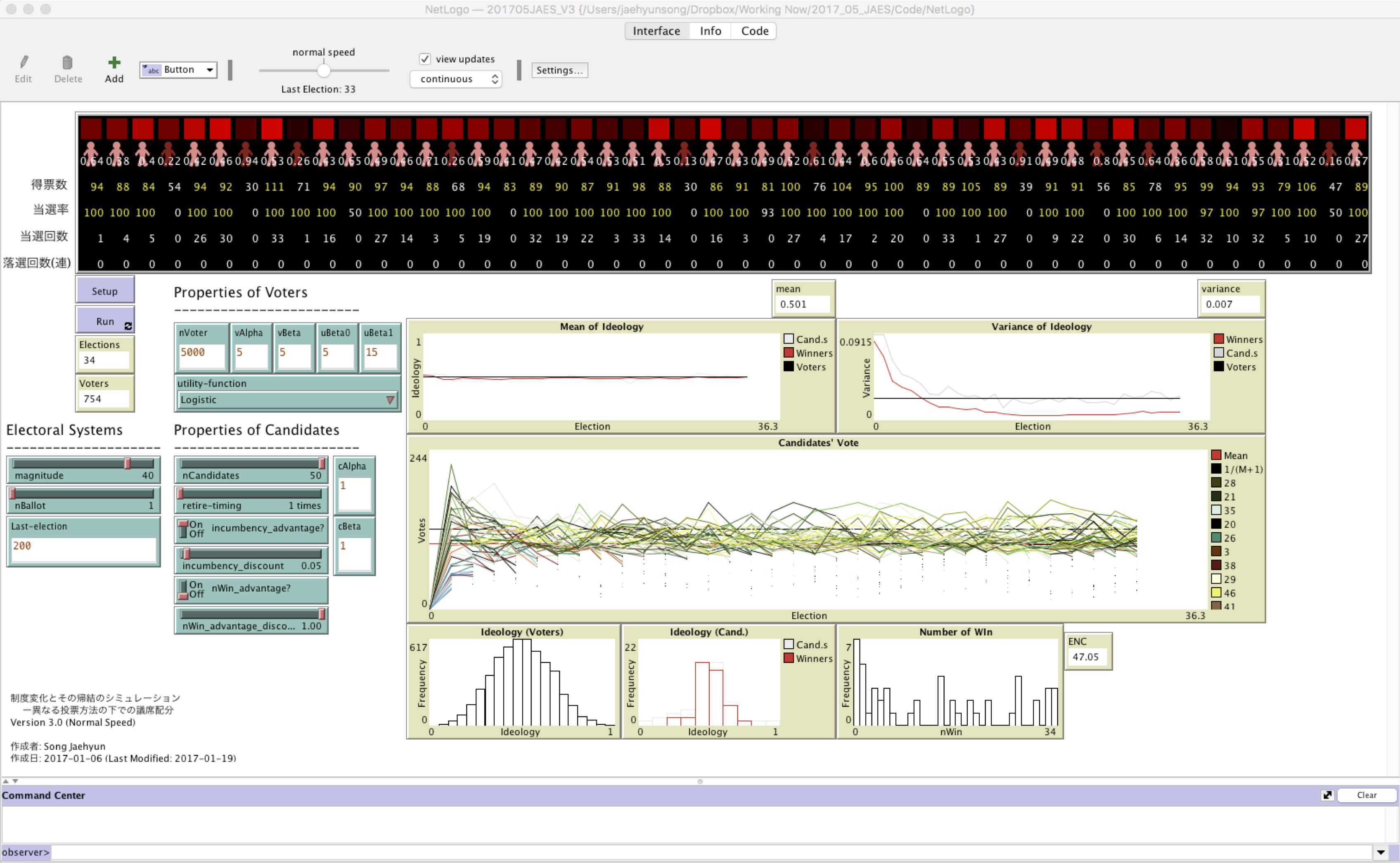 Shinada, Yutaka and Song, Jaehyun. 2017. "Agent-Based Model of Institutional Change and its Consequences: Seats Allocation under Various Electoral Systems." Japanese Association of Electoral Studies 2017 Annual Conference. Kagawa University, Japan. (= 品田裕・Song Jaehyun. 2017. 「制度変化とその帰結のシミュレーションー異なる投票方法の下での議席配分」日本選挙学会2017年大会. 香川大学)