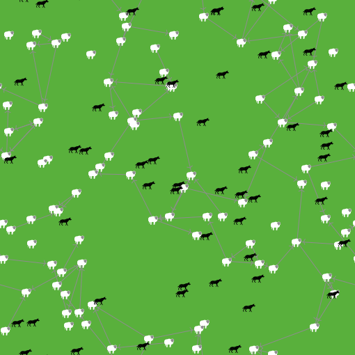 Parameters: MODEL-VERSION: Whether we model sheep wolves and grass or just sheep and wolves INITIAL-NUMBER-SHEEP: The initial size of sheep population INITIAL-NUMBER-WOLVES: The initial size of wolf population SHEEP-GAIN-FROM-FOOD: The amount of energy sheep get for every grass patch eaten (Note this is not used in the sheep-wolves model version) WOLF-GAIN-FROM-FOOD: The amount of energy wolves get for every sheep eaten SHEEP-REPRODUCE: The probability of a sheep reproducing at each time step WOLF-REPRODUCE: The probability of a wolf reproducing at each time step GRASS-REGROWTH-TIME: How long it takes for grass to regrow once it is eaten (Note this is not used in the sheep-wolves model version) SHOW-ENERGY?: Whether or not to show the energy of each animal as a number