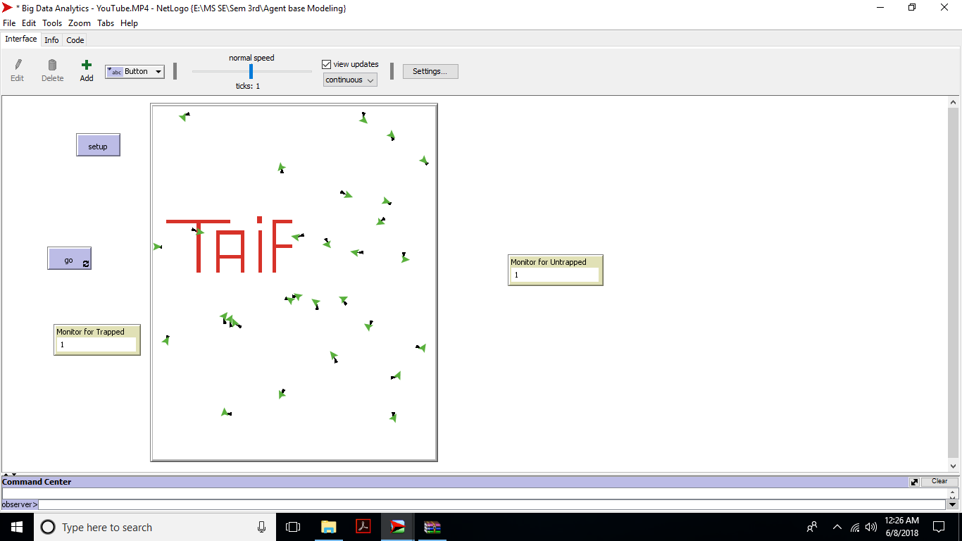ODD Model Purpose The purpose of this model is to write my name and to create breeds of turtles i.e. the breed name is taifs and the number of turtles is equal to my reg number i.e 29. Where the turtles move randomly and when they see my name letter they move toward it. They move randomly in the letter and can not move out of the name letter. State variables and scales The agents used in this model are turtles that walk randomly. And patches that is showing my name. Process Overview and scheduling First write a letters of my name i.e Taif on patches with the red color. Then create the fixed number of turtles i.e. 29 equal to my reg number and they move random move when they see the red color they move toward the red color. When they come in the letter then they only move on the letter and can not move out of the name letter. Design Concepts Emergence The name model formed an emergent behavior when the turtles see the letters of red color and move toward them. When they come in the letter then they only move on the letter and cannot move out of the name letter that form a complex behavior as a whole. Adaptation The turtles improve their fitness from the number of trapped turtles and un trapped turtles. Fitness The aim of the agents is to write name on patches and create turtles that move randomly when they see letters of name they move toward it.. When they come in the letters then they only move on the letter randomly and cannot move out of the name letter. Collectives The fixed number of turtles i.e 29 of name Taif that are used in this model where they come to the letters patches i.e. red color. Observation The data is collected for analysis by running the model for a specified number of times. From the behavior space the experiment is performed for specified number of times and save the data in the spreadsheet. The collection of data includes number of trapped and un trapped turtles in the letters. Initialization The simulation starts with writing my name i.e.TAIF through patches and create fixed number of turtles that move randomly. The name is created on fixed patches and not allowed to change for different experiments. Input Data The model does not get input data from external sources. Sub models writing Taif through patche with fixed number of turtles.