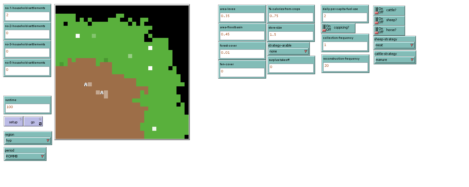 ;; This model accompanies Joyce, J. forthcoming, Modelling agricultural strategies in the Dutch Roman limes zone via agent-based modelling (ROMFARMS). Springer (Basel) ;; and Joyce, J. forthcoming, Farming along the limes. Using agent-based modelling to investigate possibilities for subsistence and surplus-based agricultural production in the Lower Rhine delta between 12BC and 270AD, PhD thesis, Vrije Universiteit Amsterdam. extensions [ gis ] breed [ settlements settlement ] breed [ persons person ] breed [ animals animal ] globals [ raster settlement-density area d-pop d1-pop elderly-male-list elderly-female-list adult-male-list adult-female-list male-4th-list female-4th-list male-3rd-list female-3rd-list male-2nd-list female-2nd-list male-1st-list female-1st-list count-children-list pop-growth calories-in-crops fallow-time basic-yield sowing-rate yield-increase-manure N-content-manure sowing-time ploughing-time manuring-time harvesting-time ploughing-labour-list total-ploughing-labour-list sowing-labour-list total-sowing-labour-list manuring-labour-list total-manuring-labour-list harvesting-labour-list total-harvesting-labour-list min-arable-land-list arable-land-list yield-list surplus-list grain-deficit-list count-famines cattle-meat-list cattle-milk-list cattle-manure-list sheep-meat-list sheep-milk-list sheep-wool-list horse-surplus-list meadow-land-list pasture-land-list fodder-collection-time total-fodder-labour-list fodder-labour-list horse-pop-list cattle-pop-list sheep-pop-list d-pop-cattle d1-pop-cattle d-pop-horse d1-pop-horse d-pop-sheep d1-pop-sheep pop-growth-sheep pop-growth-cattle pop-growth-horse adult-weight-cattle immature-weight-cattle young-weight-cattle adult-weight-sheep immature-weight-sheep young-weight-sheep %-edible-carcass-cattle %-edible-carcass-sheep milk-yield-cattle milk-yield-sheep lactation-length-cattle lactation-length-sheep wool-yield-sheep manure-daily-yield twinning-rate-sheep alphaS alphaC alphaH alpha neonatal-mortality-sheep neonatal-mortality-cattle neonatal-mortality-horse annual-mortality-rate CYMR CIMR CAMR SYMR SIMR SAMR HIMR fodder-sheep fodder-cattle fodder-horse pasture-land-sheep pasture-land-cattle pasture-land-horse yield-grassland walking-speed max-load-adult-male max-load-adult-female max-load-other fuel-collection-time timber-collection-time fuel-workforce-list total-fuel-labour-list fuel-labour-list fuel-deficit-list distance-travelled-fuel-list construction-labour-list construction-workforce-list timber-deficit-list distance-travelled-construction-list biomass-list biomass-forest-list catchment-area ] patches-own [ raster-value patch-owner landscape-type use biomass countdown-fallow countdown-reforest ] settlements-own [ no-households age people livestock catchment calories-required min-grain-store ploughing-labour-1 ploughing-labour-2 sowing-labour-1 sowing-labour-2 manuring-labour-1 manuring-labour-2 harvesting-labour-1 harvesting-labour-2 grain-store max-arable-land-land max-arable-land-grain max-arable-land-labour min-arable-land arable-land yield-grain surplus-grain grain-deficit SNM CNM SYM CYM SIM CIM SAM CAM cattle-meat-yield sheep-meat-yield cattle-milk-yield sheep-milk-yield sheep-wool-yield cattle-manure-yield horse-surplus pasture-land meadow-land fodder-labour-1 fodder-labour-2 fuel-workforce fuel-store fuel-target fuel-requirement fuel-labour-1 fuel-labour-2 construction-requirement construction-store construction-target construction-workforce construction-labour ] persons-own [ sex age my-spouse my-house distance-travelled-fuel distance-travelled-construction count-children mortality fertility load max-load processing-time-fuel processing-time-timber ] animals-own [ age sex species fertility survivorship my-owner lactating ] to setup ca setup-landscape setup-globals setup-agents reset-ticks end to go if ticks = runtime[ stop ] if not any? settlements [ stop ] go-demography go-arable go-pastoral go-fuel go-construction update-globals update-patches ask settlements [ ifelse age = reconstruction-frequency [ set age 0 ] [ set age age + 1 ] ] tick end to setup-landscape ;; sub-process generates landscape within which agents interact. Landscapes can be randomly-generated ("hyp") or reconstructed from palaeogeographic data (1-32). if region = "hyp" [ resize-world -16 16 -16 16 set-patch-size 13 if area-levee > 0 [ ask one-of patches [ set pcolor brown set landscape-type "levee" ] while [ count patches with [ pcolor = brown ] < ( count patches * area-levee ) ] [ ask one-of patches with [ pcolor = brown ] [ if any? neighbors with [ pcolor != brown ] [ ask one-of neighbors with [ pcolor != brown ] [ set pcolor brown set landscape-type "levee" ] ] ] ] ] if area-floodbasin > 0 [ while [ count patches with [ pcolor = green ] < ( count patches * area-floodbasin ) and any? patches with [ pcolor = brown and any? neighbors with [ pcolor != brown and pcolor != green ] ] ] [ ask one-of patches with [ pcolor = brown ] [ if any? neighbors with [ pcolor != brown and pcolor != green ] [ ask one-of neighbors with [ pcolor != brown and pcolor != green ] [ set pcolor green set landscape-type "floodbasin" ] ] ] ] while [ count patches with [ pcolor = green ] < ( count patches * area-floodbasin ) and count patches with [ pcolor = black ] > 0 ] [ ask one-of patches with [ pcolor = green ] [ if any? neighbors with [ pcolor != brown and pcolor != green ] [ ask one-of neighbors with [ pcolor != green and pcolor != brown ] [ set pcolor green set landscape-type "floodbasin" ] ] ] ] ] ask patches [ set raster-value "null" ] ] ask patches [ set raster-value "null" ] if region != "hyp" [ ;; if a reconstructed landscaped is simulate, sub-process loads the relevant raster file and assigns a settlement density value depending on period to be simulated. gis:load-coordinate-system "C:/Users/jamaa/Documents/USB 10072017/Palaeogeography/UTM_zone31N.prj" resize-world -50 50 -50 50 set-patch-size 5 if region = 1 [ set raster gis:load-dataset "C:/Users/jamaa/