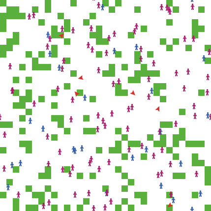 ;;creating the breeds, i can know refer to them ;; associating an agent (resistance and soif) breed [humans human] breed [vampires vampire] breed [immunes immune] humans-own [struggle? resistance hum-energy wall-turn-check breeding-random ] immunes-own [imenergy wall-turn-check breeding-random] vampires-own [soif batenergy wall-turn-check pity ] to wall-draw ;; Use the mouse to draw buildings. if mouse-down? [ ask patch mouse-xcor mouse-ycor [ set pcolor grey ]] end to door-draw ;; Use the mouse to draw buildings. if mouse-down? [ ask patch mouse-xcor mouse-ycor [ set pcolor cyan ]] end to setup clear-all setup-patches set-default-shape humans "person" set-default-shape immunes "person" ; set color humans "blue" setup-individuals reset-ticks ;set vampires end to setup-patches ask patches [ set pcolor white ] ask n-of initial-food-patches patches [ set pcolor green ] end to setup-individuals create-humans initial-nb-humans - (initial-nb-humans * (initial-prop-immunes / 100)) [ set size 1 set resistance random-normal initial-resistance-mean 1 setxy random-xcor random-ycor set color blue set hum-energy hum-energy + 5 ] create-vampires initial-number-vampires [ set size 1 set soif random-normal initial-soif-mean 1 setxy random-xcor random-ycor set color red set batenergy batenergy + initial-vampires-energy ] create-immunes initial-nb-humans * (initial-prop-immunes / 100) [ set size 1 setxy random-xcor random-ycor set color magenta set imenergy imenergy + 10 ] end to go ifelse red-queen-model ; go command for red-queen model [ ask humans [eat-food ] ask vampires [ if any? humans-here [ hunt-humans?3 ] rt random-float 50 - random-float 50 fd 1 if [pcolor] of patch-ahead 1 = grey [wall] if [pcolor] of patch-ahead 1 = magenta [wall] set batenergy batenergy - 1 ] ask humans [ rt random-float 50 - random-float 50 fd 1 set hum-energy hum-energy - 1 if [pcolor] of patch-ahead 1 = grey [wall] if hum-energy > starvation-level[ if [pcolor] of patch-ahead 1 = magenta [wall]] set struggle? false ] ask humans [eat-food] ask humans [reproduce] ask humans [check-death-humans] ask vampires [check-death-vampires] regrow-grass tick ] ;;go command for normal model [ ask vampires [ if any? humans-here [ hunt-humans? ] rt random-float 50 - random-float 50 fd 1 if [pcolor] of patch-ahead 1 = grey [wall] if [pcolor] of patch-ahead 1 = cyan [wall] set batenergy batenergy - 1] if mortal-vampires = true [ ask vampires [check-death-vampires]] ask immunes [ rt random-float 50 - random-float 50 fd 1 set imenergy imenergy - 1 if [pcolor] of patch-ahead 1 = grey [wall] if imenergy > starvation-level[ if [pcolor] of patch-ahead 1 = cyan [wall]] set imenergy imenergy - 1 eat-food2 reproduce4 check-death-immunes] ask humans [eat-food rt random-float 50 - random-float 50 fd 1 set hum-energy hum-energy - 1 if [pcolor] of patch-ahead 1 = grey [wall] if hum-energy > starvation-level[ if [pcolor] of patch-ahead 1 = cyan [wall]] eat-food reproduce check-death-humans] ask immunes [reproduce4] regrow-grass tick ] end to reproduce3 if random 1000 < 3 [ask humans [ hatch 1]] end to hunt-humans? set pity random 100 if pity < vampirification-probability [ask vampires [ if breed = vampires and count vampires < max-population [let hunted one-of (humans-here ) if hunted != nobody [ask hunted [ set breed vampires set batenergy batenergy + initial-vampires-energy set color red]] ;ask humans-on patch-here [die] ;hatch-vampires 1 [set color red ;set batenergy batenergy + initial-vampires-energy] ] ]] if pity > vampirification-probability [if any? humans-on patch-here [hunt-humans]] end to hunt-humans?3 set pity random 10 let hunted one-of humans-here if hunted != nobody [ ask hunted [ set struggle? true ] ifelse soif > [ resistance ] of hunted ; si soif>resistance, lance le hunt-humans normal [ask vampires [ if pity < vampirification-probability [ask vampires [ if breed = vampires and count vampires < max-population [ask humans-on patch-here [set breed vampires set batenergy batenergy + 10] ask turtles-on patch-here [set color red]] ] ] if pity > vampirification-probability [if any? humans-on patch-here [hunt-humans]] ]] ; si soif[ask vampires [rt random-float 50 - random-float 50 fd 1 if [pcolor] of patch-ahead 1 = grey [wall] if [pcolor] of patch-ahead 1 = magenta [wall] set batenergy batenergy - 20 ]]] end to hunt-humans?2 set pity random 10 if pity < vampirification-probability [if any? humans-on patch-here [hunt-humans]] if pity > vampirification-probability [ hatch-vampires 1 [set batenergy batenergy + 20 ]] end to eat-food ask humans [ if pcolor = green [ set pcolor white set hum-energy hum-energy + 10 ] ifelse show-energy? [ set label hum-energy set label-color black] [ set label "" ] ] end to eat-food2 ask immunes [ if pcolor = green [ set pcolor white set imenergy imenergy + 10 ] ifelse show-energy? [ set label imenergy set label-color black] [ set label "" ] ] end to hunt-humans let hunted one-of (humans-here );with [not struggle?]) if hunted != nobody [ ; ask hunted [ set struggle? true ] ; ifelse soif > [ resistance ] of hunted ask hunted [ die ] set batenergy batenergy + 10 ] ; [ ; if soif != [ resistance ] of hunted [ die ] ; ] ;] end to create-vampires? create-vampires 1 [ set size 1 set soif random-normal initial-soif-mean 1 setxy random-xcor random-ycor set color red] end to reproduce set breeding-random random 100 ifelse breeding-random < breeding-probabilities [ifelse immunes-random-occurence < random 1000 [ask humans [ if breed = humans and (count humans + count immunes ) < max-population [if hum-energy > 50 [ set hum-energy hum-energy - 50 hatch 1 [ set hum-energy 50 ] ]]]] [ask humans [ if breed = humans and (count humans + count immunes ) < max-population [if hum-energy > 50 [ set hum-energy hum-energy - 50 hatch-immunes 1 [ set imenergy 50 set color magenta] ]]]] ] [ ask humans []] end to reproduce4 set breeding-random random 10 ifelse breeding-random < breeding-probabilities [ifelse immunes-random-occurence < random 10
