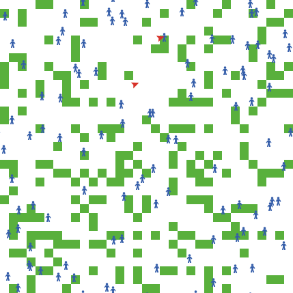 ;;creating the breeds, i can know refer to them ;; associating an agent (resistance and soif) breed [humans human] breed [vampires vampire] breed [immunes immune] humans-own [struggle? resistance hum-energy wall-turn-check breeding-random ] immunes-own [imenergy wall-turn-check breeding-random] vampires-own [soif batenergy wall-turn-check pity ] to wall-draw ;; Use the mouse to draw buildings. if mouse-down? [ ask patch mouse-xcor mouse-ycor [ set pcolor grey ]] end to door-draw ;; Use the mouse to draw buildings. if mouse-down? [ ask patch mouse-xcor mouse-ycor [ set pcolor cyan ]] end to setup clear-all setup-patches set-default-shape humans "person" set-default-shape immunes "person" ; set color humans "blue" setup-individuals reset-ticks ;set vampires end to setup-patches ask patches [ set pcolor white ] ask n-of initial-food-patches patches [ set pcolor green ] end to setup-individuals create-humans initial-nb-humans - (initial-nb-humans * (initial-prop-immunes / 100)) [ set size 1 set resistance random-normal initial-resistance-mean 1 setxy random-xcor random-ycor set color blue set hum-energy hum-energy + 5 ] create-vampires initial-number-vampires [ set size 1 set soif random-normal initial-soif-mean 1 setxy random-xcor random-ycor set color red set batenergy batenergy + initial-vampires-energy ] create-immunes initial-nb-humans * (initial-prop-immunes / 100) [ set size 1 setxy random-xcor random-ycor set color magenta set imenergy imenergy + 10 ] end to go ifelse red-queen-model ; go command for red-queen model [ ask humans [eat-food ] ask vampires [ if any? humans-here [ hunt-humans?3 ] rt random-float 50 - random-float 50 fd 1 if [pcolor] of patch-ahead 1 = grey [wall] if [pcolor] of patch-ahead 1 = magenta [wall] set batenergy batenergy - 1 ] ask humans [ rt random-float 50 - random-float 50 fd 1 set hum-energy hum-energy - 1 if [pcolor] of patch-ahead 1 = grey [wall] if hum-energy > starvation-level[ if [pcolor] of patch-ahead 1 = magenta [wall]] set struggle? false ] ask humans [eat-food] ask humans [reproduce] ask humans [check-death-humans] ask vampires [check-death-vampires] regrow-grass tick ] ;;go command for normal model [ ask vampires [ if any? humans-here [ hunt-humans? ] rt random-float 50 - random-float 50 fd 1 if [pcolor] of patch-ahead 1 = grey [wall] if [pcolor] of patch-ahead 1 = cyan [wall] set batenergy batenergy - 1] if mortal-vampires = true [ ask vampires [check-death-vampires]] ask immunes [ rt random-float 50 - random-float 50 fd 1 set imenergy imenergy - 1 if [pcolor] of patch-ahead 1 = grey [wall] if imenergy > starvation-level[ if [pcolor] of patch-ahead 1 = cyan [wall]] set imenergy imenergy - 1 eat-food2 reproduce4 check-death-immunes] ask humans [eat-food rt random-float 50 - random-float 50 fd 1 set hum-energy hum-energy - 1 if [pcolor] of patch-ahead 1 = grey [wall] if hum-energy > starvation-level[ if [pcolor] of patch-ahead 1 = cyan [wall]] eat-food reproduce check-death-humans] ask immunes [reproduce4] regrow-grass tick ] end to reproduce3 if random 1000 < 3 [ask humans [ hatch 1]] end to hunt-humans? set pity random 100 if pity < vampirification-probability [ask vampires [ if breed = vampires and count vampires < max-population [let hunted one-of (humans-here ) if hunted != nobody [ask hunted [ set breed vampires set batenergy batenergy + initial-vampires-energy set color red]] ;ask humans-on patch-here [die] ;hatch-vampires 1 [set color red ;set batenergy batenergy + initial-vampires-energy] ] ]] if pity > vampirification-probability [if any? humans-on patch-here [hunt-humans]] end to hunt-humans?3 set pity random 10 let hunted one-of humans-here if hunted != nobody [ ask hunted [ set struggle? true ] ifelse soif > [ resistance ] of hunted ; si soif>resistance, lance le hunt-humans normal [ask vampires [ if pity < vampirification-probability [ask vampires [ if breed = vampires and count vampires < max-population [ask humans-on patch-here [set breed vampires set batenergy batenergy + 10] ask turtles-on patch-here [set color red]] ] ] if pity > vampirification-probability [if any? humans-on patch-here [hunt-humans]] ]] ; si soif[ask vampires [rt random-float 50 - random-float 50 fd 1 if [pcolor] of patch-ahead 1 = grey [wall] if [pcolor] of patch-ahead 1 = magenta [wall] set batenergy batenergy - 20 ]]] end to hunt-humans?2 set pity random 10 if pity < vampirification-probability [if any? humans-on patch-here [hunt-humans]] if pity > vampirification-probability [ hatch-vampires 1 [set batenergy batenergy + 20 ]] end to eat-food ask humans [ if pcolor = green [ set pcolor white set hum-energy hum-energy + 10 ] ifelse show-energy? [ set label hum-energy set label-color black] [ set label "" ] ] end to eat-food2 ask immunes [ if pcolor = green [ set pcolor white set imenergy imenergy + 10 ] ifelse show-energy? [ set label imenergy set label-color black] [ set label "" ] ] end to hunt-humans let hunted one-of (humans-here );with [not struggle?]) if hunted != nobody [ ; ask hunted [ set struggle? true ] ; ifelse soif > [ resistance ] of hunted ask hunted [ die ] set batenergy batenergy + 10 ] ; [ ; if soif != [ resistance ] of hunted [ die ] ; ] ;] end to create-vampires? create-vampires 1 [ set size 1 set soif random-normal initial-soif-mean 1 setxy random-xcor random-ycor set color red] end to reproduce set breeding-random random 100 ifelse breeding-random < breeding-probabilities [ifelse immunes-random-occurence < random 1000 [ask humans [ if breed = humans and (count humans + count immunes ) < max-population [if hum-energy > 50 [ set hum-energy hum-energy - 50 hatch 1 [ set hum-energy 50 ] ]]]] [ask humans [ if breed = humans and (count humans + count immunes ) < max-population [if hum-energy > 50 [ set hum-energy hum-energy - 50 hatch-immunes 1 [ set imenergy 50 set color magenta] ]]]] ] [ ask humans []] end to reproduce4 set breeding-random random 10 ifelse breeding-random < breeding-probabilities [ifelse immunes-random-occurence < random 10
