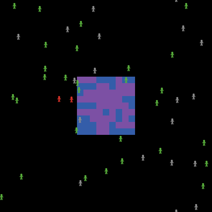 patches-own [infected?] turtles-own [cholera gender age] to setup ca reset-ticks setup-patches setup-turtles colors end to go colors infect-water infect-people birth ask turtles [ wiggle set age (age + 1) ; their age is in weeks if (age > 3910) [die] ; since ticks are weeks and 3910 are the average weeks a person lives in their life, they will die after 3910 weeks ] tick if (count turtles > 5000 or count turtles < 1) [stop] end to wiggle ; moving of the people fd 1 lt random 61 - 30 end to infect-water ; determines whether or not the water is infected ask patches with [infected? = 0] [ ; infecting water if (any? turtles-here with [cholera = 1]) [set infected? 1] ] ask patches with [infected? = 1] [ if (random 100 < Disinfect) [set infected? 0] ; disinfecting water ] end to infect-people ; determines whether or not someone is infected ask turtles with [cholera = 0] [ if (pcolor = violet) [ set cholera 1 ; infecting people from water ] if (any? turtles-here with [cholera = 1]) [set cholera 1] ; infecting people from other people ] ask turtles with [cholera = 1] [ ; rate of survival, death or continuing with the disease if (random 100 < 10) [die] if (random 100 < 10) [set cholera 0] ] end to colors ; shows who and which patches are infected ask patches [ if (infected? = 1) [set pcolor violet] if (infected? = 0) [set pcolor blue] if (infected? = -1) [set pcolor black] ] ask turtles [ if (cholera = 1) [set color red] if (cholera = 0) [set color green] if (cholera = -1) [set color grey] ] end to birth ; reproducing population ask turtles with [gender = 1] [ if (any? turtles-here with [gender = -1] and random 100 >= 90) [hatch 1 [set cholera 0 set age 0 ifelse (random 2 = 0) [set gender 1] [set gender -1] ] ] ] end to setup-patches ask patches [set infected? -1] ask patches with [pxcor > -5 and pxcor < 5 and pycor > -5 and pycor < 5] [set infected? 0] ; creates water end to setup-turtles ask turtles [set gender 0] set-default-shape turtles "person" crt 100 [ ; creates people setxy random-xcor random-ycor set age random 3910 set cholera 0 ] ask turtles ; creates vaccinated and infected people [if (random 100 < numVaccinated) [set cholera -1] if (cholera = 0 and random 100 < numInfected) [set cholera 1] ] ask n-of 50 turtles [set gender 1] ; creating genders ask turtles with [gender = 0] [set gender -1] end
