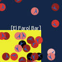 • The World is a dynamic pictogram where a number of flibs move between two distinct areas: 'El Farol' Bar (yellow) and 'Elsewhere' (blue). The coordinates of a flib are not relevant; the only important thing is whether it is in the area of the bar or not. The colour of the flibs reflects their fitness level: white stands for 0%, black for 100% and red shades stand for intermediate fitness values.