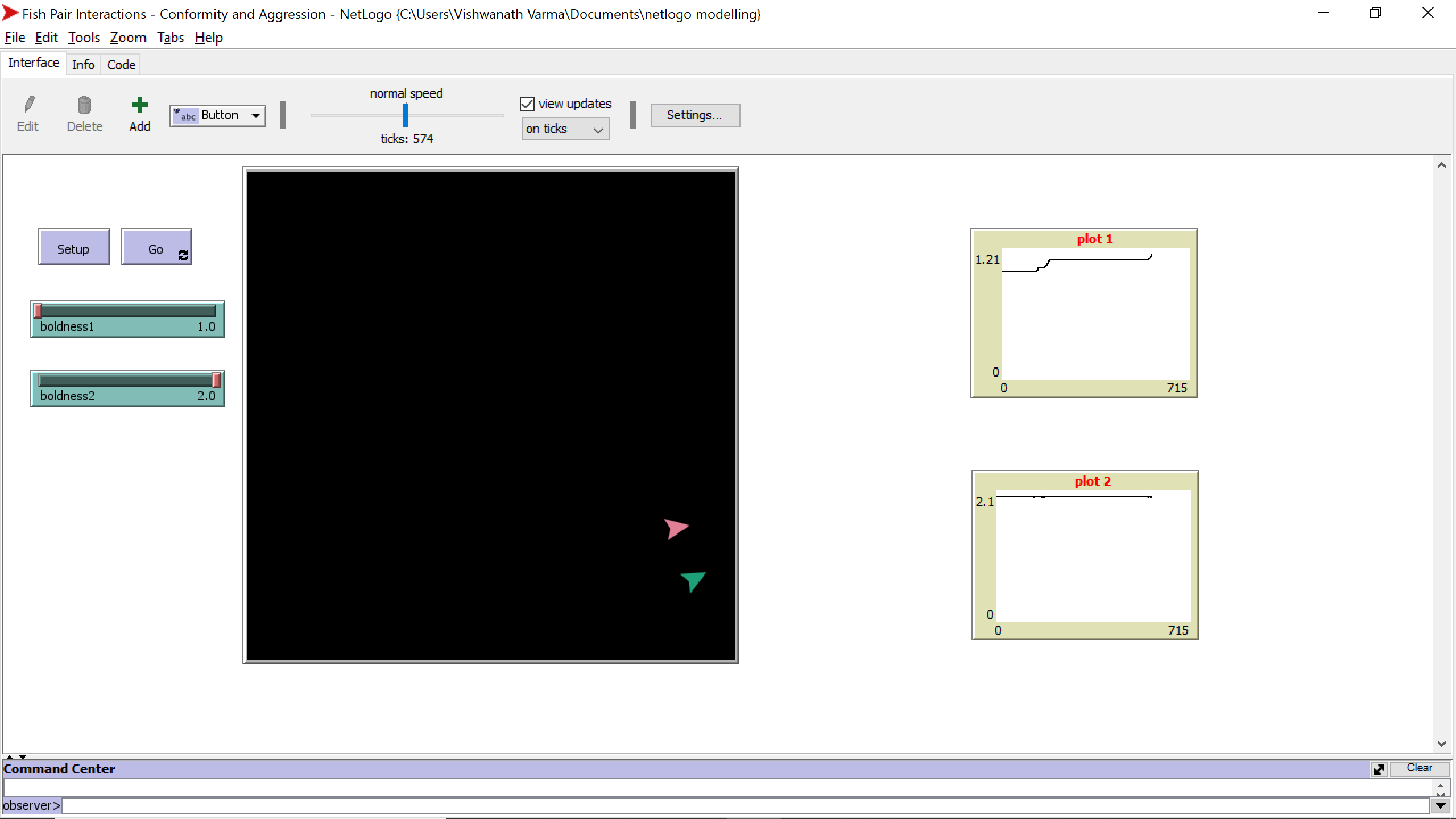 turtles-own [ speed neighbor plasticity aggression a-countdown ] breed [ fishes fish ] to setup clear-all reset-ticks create-fishes 1 [ set size 2 set speed boldness1 + random-normal 0 0.1 set a-countdown 0 ifelse boldness1 = 1 [ set plasticity 0.005 + random-normal 0 0.001 ] [ set plasticity 0.0035 + random-normal 0 0.001 ] setxy random-xcor random-ycor ] create-fishes 1 [ set size 2 set speed boldness2 + random-normal 0 0.1 set a-countdown 0 ifelse boldness2 = 1 [ set plasticity 0.005 + random-normal 0 0.001 ] [ set plasticity 0.0035 + random-normal 0 0.001 ] setxy random-xcor random-ycor ] end to go ask turtles [ set neighbor one-of other turtles move chase-escape change-speed ] tick end to move rt random 20 lt random 20 fd 1 * speed end to chase-escape if distance neighbor < 5 and [ speed ] of self > [ speed ] of neighbor and a-countdown < 0 [ set heading towards neighbor fd 1.5 set aggression 1 set a-countdown 10 ] if distance neighbor < 3 and [ speed ] of self < [ speed ] of neighbor [ set heading [heading] of neighbor + random-normal 90 25 fd 2 set aggression 0 ] if distance neighbor > 5 [ interact ] set a-countdown a-countdown - 1 end to interact if distance neighbor > 10 and any? other turtles in-cone 10 60 [ set heading towards neighbor set heading heading + random-normal 0 20 ] if distance neighbor < 10 [ set heading [heading] of neighbor + random-normal 0 20 ] end to change-speed if distance neighbor < 5 [ set speed speed + ([ speed ] of neighbor - [ speed ] of self) * plasticity + random-normal 0 0.001 ] if ([ speed ] of neighbor < [ speed ] of self) and distance neighbor < 10 [ set speed speed + plasticity + random-normal 0 0.001 ] if speed > 2 [ set speed 2 ] if speed < 1 [ set speed 1 ] end