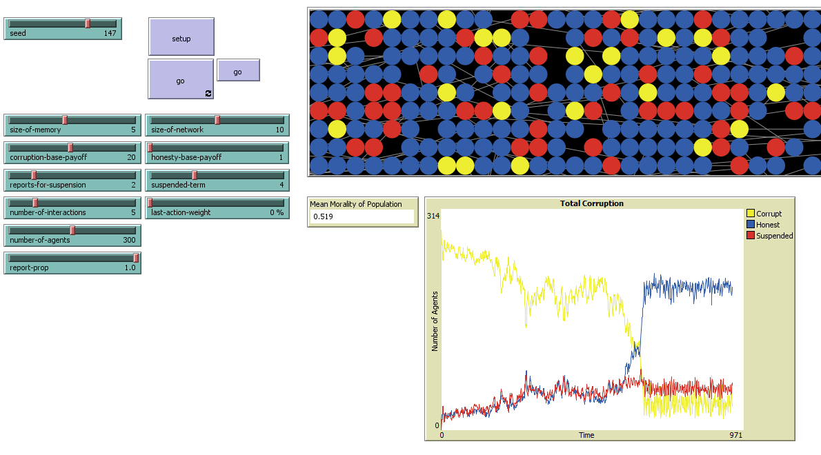 References: Hammond, R. (2000). Endogenous transition dynamics in corruption: An agent-based computer model: Center on Social and Economic Dynamics. (http://www.elautomataeconomico.com.ar/download/papers/Corrupcion-Hammond.pdf)