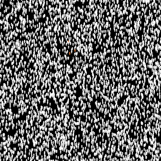 People move about randomly, and if they run into a person who is sick, they have a chance of getting sick themselves. The illness runs on average two weeks, and has a 1% death rate. These processes are all stochastic, so somebody could die on day 2 of the illness, or could have it for a month