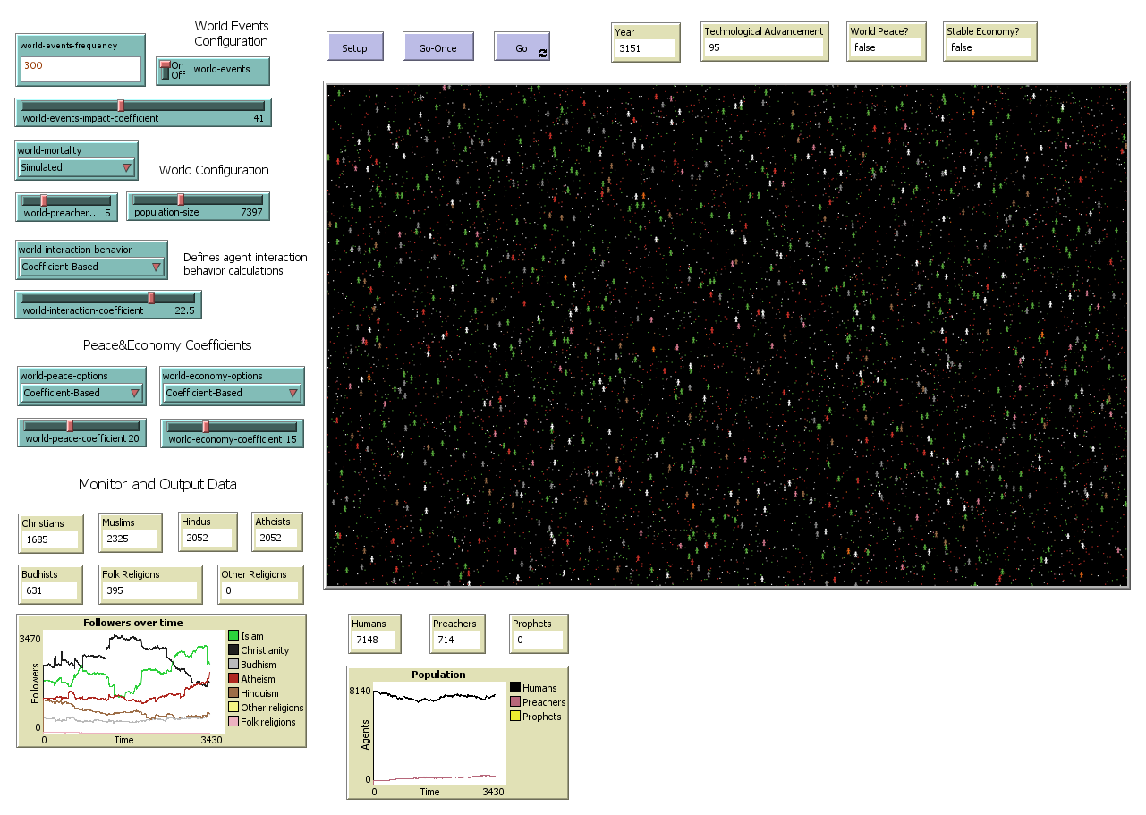 ;;The Evolution of Religion ;; This NetLogo model is to simulate the evolution of religion ;; Breeds and their shared or type-specific attributes breed[humans human] ;; set size 1 for regular human to distinguish them in the interface from other breeds breed[preachers preacher] ;; set size 5 for preacher breed[prophets propeth] ;; set size 50 for the propeth turtles-own[ age ;; 1:N (current age of the agent) lifespan ;; N (age of death of the agent) religion ;; string (religion of the agent) religiosity ;; 0:10 (religiosity of the agent) openness ;; 0:10 (how open the agent is to new ideas) trust ;; 0:10 (how confidental the agent is) influence ;; 0:10 (how influential the agent is in the world) radius ;; 0:N (physical radius of interaction) movementSpeed ;; 1:N (defines node moves per tick) ] ;; Global variables declared on the interface: ;; population-size 0:N (size of starting population) ;; world-events T:F (enables/disables world events) ;; world-events-frequency 0:N (determines the max frequency of world events by the formula (random thisVariable)) ;; world-events-impact-coefficient 0:N (determines the impact that the world events will have on religions) globals[ world-age ;; 0:N (current age of the world) world-technological-advancement ;; 0:100 (technological advancement of the world) world-economy? ;; T:F (whether the world economy is stable or not) MOZDA DA RAZMJENJUJU NOVAC AGENTI PA DA TAKO UTICEMO NA EKONOMIJU.. world-peace? ;; T:F (whether the world is at peace or not) ;; Temp Variables world-events-current-frequency world-preachers-percentage ;; Religions world-religions world-religions-colors world-religions-population ] ;; Setup Method to setup clear-all reset-ticks init-variables init-patches init-turtles print-world-config ;;show word "Most dominant starting religion: " get-world-religion-influence["christianity"] - Get Religion Current Influence end ;; Init World Variables to init-variables set world-age 1 set world-technological-advancement 1 set world-peace? false set world-economy? false set world-preachers-percentage world-preachers-percentage-ui ;;Setting the preachers percentage according to the UI set world-events-current-frequency (random world-events-frequency) + 1 ;;Setting the current world event frequency ifelse(world-preachers-percentage != 0)[set world-preachers-percentage world-preachers-percentage / 100] ;;Taking the percentage and transforming it into decimals [set world-preachers-percentage 0] set world-religions["christianity" "islam" "hinduism" "atheism" "budhism" "folk-religion" "other-religion"] ;; Religions of the world set world-religions-colors[white green brown red gray pink yellow] ;; Colors to represent religion set world-religions-population[0.31 0.24 0.15 0.16 0.07 0.06 0.005] ;; Percentage of agents per religion end ;; Init Patches Method to init-patches ask patches[ set pcolor black ] end ;; Init Turtles Method to init-turtles let number-of-preachers (int(world-preachers-percentage * population-size)) let number-of-humans (population-size - number-of-preachers) create-humans population-size create-preachers number-of-preachers ask turtles[ turtles-set-init-values ] ;; Assigning religions per percentage, data from: Size of Major Religious Groups, 2020 on Wikipedia let counter 0 foreach(world-religions-population)[ let percentage int(item counter world-religions-population * population-size) ask n-of percentage turtles with[religion = "none"][set religion item counter world-religions set color item counter world-religions-colors] set counter counter + 1 ] end to turtles-set-init-values setxy random-xcor random-ycor set shape "person" set age 0 set lifespan random 300 if lifespan < 18[set lifespan lifespan + 18] if (breed = humans) [set size 1 set radius 1 set movementSpeed 1] if (breed = preachers)[set size 6 set radius 3 set movementSpeed 2] set religion random 11 set religiosity random 11 set openness random 11 set trust random 11 set influence random 11 set religion "none" end ;; Print World Config Method - prints the world configuration to print-world-config show "--------------------" show "World Configuration" show " " show word "World Population: " population-size let number-of-preachers (int(world-preachers-percentage * population-size)) let number-of-humans (population-size - number-of-preachers) show word "Humans: " number-of-humans show word "Preachers: " number-of-preachers show " " show "World Peace: Active" show "World Economy: Stable" show " " ifelse world-events[ ;; We print the world-events configuration if they are enabled show "World Events: Enabled" show word "World Events Impact Percentage: " world-events-impact-coefficient show word "World Events Frequency: " world-events-frequency ] [show "World Events: Disabled"] end ;; Go Method which loops the go-once method to go go-once end ;; Go Once Method updated 1/per tick to go-once ask turtles[ turtles-move turtles-age if (breed = humans)[ ;; Human specific behaviors human-interaction ] if (breed = preachers)[ preacher-interaction ;; Preacher specific behaviors ] if (breed = prophets)[ ;; Prophet specific behaviors prophet-interaction ] ] world-event-check ;; Check if it is time for a world event world-update ;; Update the world variables such as age, technology, etc ... end ;; Turtle Movement - they move in random directions 1 field per tick to turtles-move rt random 100 lt random 100 fd movementSpeed end ;; Turtles age to turtles-age set age age + 1 if age > lifespan[ if count turtles > 25000 [die] if world-mortality = "Constant"[turtles-born die] if world-mortality = "Simulated"[ ;; Code for simulated reporoduction let children random 2 if (children = 0)[ let number-of-children random 3 loop[ ifelse(number-of-children != 0)[ set number-of-children number-of-children - 1 turtles-born ][stop] ] ] die ] if world-mortality = "Increasing"[if count turtles > 1000 [die]] if world-mortality = "Decreasing"[turtles-born turtles-born die] ] end ;; Birth of turtle to turtles-born 