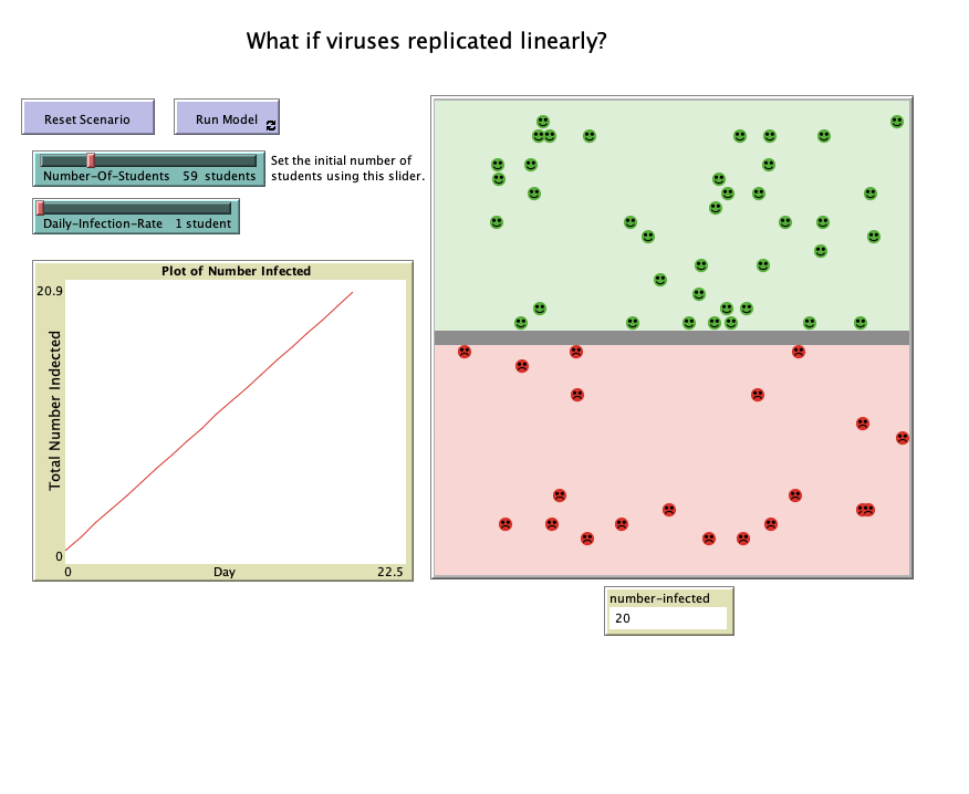 Choose the number of people to start and run model - which adds 1 new infection per tick (day).