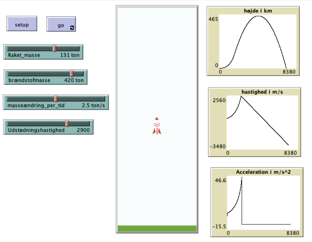 This is a simple program where the rocket only moves vertically. It is possible to compare the numerical calculation in this simulation with the rocket equation.