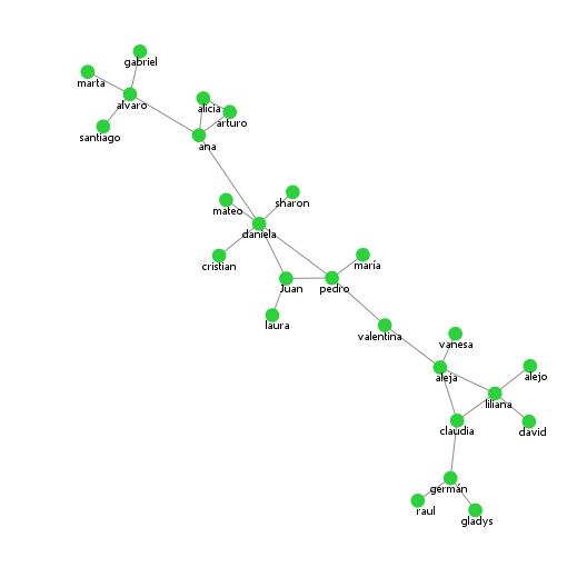 extensions [nw] breed[nodes node] nodes-own[nombre ] globals [nombres select] ;;;;;;;;;;;;;;;;;;;;;;;;;;;;;;;;;; ;;;;;;;;;;;;;;;;;;;;;;;;;;;;;;;;; ;;;;;;;;; layouts;;;;;;;;;;;;;;;; ;;;;;;;;;;;;;;;;;;;;;;;;;;;;;;;; ;;;;;;;;;;;;;;;;;;;;;;;;;;;;;;;;;; to spring layout-spring turtles links .25 1 calibrar end to circle layout-circle nodes 10 end ;;;;;;;;;;;;;;;;;;;;;;;;;;;;;;;;;; ;;;;;;;;;;;;;;;;;;;;;;;;;;;;;;;;; ;;;;medidas centrales ;;;;;;;;;;;; ;;;;;;;;;;;;;;;;;;;;;;;;;;;;;;;; ;;;;;;;;;;;;;;;;;;;;;;;;;;;;;;;;;; to closeness ask nodes [ set label precision ( nw:closeness-centrality) 2 ] end to cluster ask nodes [ set label precision ( nw:clustering-coefficient) 5 ] end to rank ask nodes [ set label precision ( nw:page-rank) 2 ] end ;;;;;;;;;;;;;;;;;;;;;;;;;;;;;;;;;; ;;;;;;;;;;;;;;;;;;;;;;;;;;;;;;;;; ;;;;;;;;; Varios ;;;;;;;;;;;;;;;; ;;;;;;;;;;;;;;;;;;;;;;;;;;;;;;;; ;;;;;;;;;;;;;;;;;;;;;;;;;;;;;;;;;; to nombre-nodos ask nodes[ set label nombre] end to sin-nombre ask nodes[ set label ""] end to degree ask nodes [ let grado count my-links set label grado set size (sqrt grado) + 0.5 set color scale-color green grado maxi 0 ] end to poner-nombres set nombres [ "Juan" "pedro" "maría" "valentina" "daniela" "laura" "mateo" "sharon" "ana" "cristian" "aleja" "vanesa" "liliana" "claudia" "alejo" "david" "germán" "raul" "gladys" "alvaro" "marta" "santiago" "gabriel" "alicia" "arturo"] foreach (n-values (count nodes) [ i -> i ]) [ i -> let tam length nombres ask node i [set label (item (i mod tam) nombres) set nombre (item (i mod tam) nombres)] ] end ;;;;;;;;;;;;;;;;;;;;;;;;;;;;;;;;;; ;;;;;;;;;;;;;;;;;;;;;;;;;;;;;;;;; ;;;;;;;;; Redes;;;;;;;;;;;;;;;; ;;;;;;;;;;;;;;;;;;;;;;;;;;;;;;;; ;;;;;;;;;;;;;;;;;;;;;;;;;;;;;;;;;; to cargar-grafo ca ask patches [set pcolor white ] nw:load user-file nodes links ask nodes [ set shape "dot" set color lime set size 2 set label who set label-color black ] end to small-world ca ask patches [set pcolor white] nw:generate-watts-strogatz nodes links 24 2 0.1 ask nodes [ set shape "dot" set color lime set size 2 set label who set label-color black ] end to red-random ca ask patches [set pcolor white] nw:generate-random nodes links 24 0.3 ask nodes [ set shape "dot" set color lime set size 2 set label who set label-color black ] end to hubs ca ask patches [set pcolor white] nw:generate-preferential-attachment nodes links 24 1 [ set shape "dot" set color lime set size 2 set label who set label-color black ] end to completo ca ask patches [set pcolor white] ask n-of 24 patches [sprout-nodes 1] ask nodes [create-links-with other nodes] ask nodes [ set shape "dot" set color lime set size 2 set label who set label-color black ] end to legara ca ask patches [set pcolor white] ask n-of 25 patches [sprout-nodes 1] ask nodes [ set shape "dot" set color lime set size 2 set label who set label-color black ] ask turtle 0[ create-link-with (turtle 1)] ask turtle 0[ create-link-with (turtle 4)] ask turtle 0[ create-link-with (turtle 5)] ask turtle 1[ create-link-with (turtle 3)] ask turtle 1[ create-link-with (turtle 2)] ask turtle 1[ create-link-with (turtle 4)] ask turtle 3[ create-link-with (turtle 10)] ask turtle 4[ create-link-with (turtle 6)] ask turtle 4[ create-link-with (turtle 7)] ask turtle 4[ create-link-with (turtle 8)] ask turtle 4[ create-link-with (turtle 9)] ask turtle 8[ create-link-with (turtle 19)] ask turtle 8[ create-link-with (turtle 23)] ask turtle 8[ create-link-with (turtle 24)] ask turtle 10[ create-link-with (turtle 11)] ask turtle 10[ create-link-with (turtle 12)] ask turtle 10[ create-link-with (turtle 13)] ask turtle 12[ create-link-with (turtle 13)] ask turtle 12[ create-link-with (turtle 14)] ask turtle 12[ create-link-with (turtle 15)] ask turtle 13[ create-link-with (turtle 16)] ask turtle 16[ create-link-with (turtle 17)] ask turtle 16[ create-link-with (turtle 18)] ask turtle 19[ create-link-with (turtle 20)] ask turtle 19[ create-link-with (turtle 21)] ask turtle 19[ create-link-with (turtle 22)] ask turtle 23[ create-link-with (turtle 24)] ask turtle 0 [set nombre "Juan"] ask turtle 1 [ set nombre "pedro"] ask turtle 2 [ set nombre "maría"] ask turtle 3 [set nombre "valentina"] ask turtle 4 [set nombre "daniela"] ask turtle 5 [set nombre "laura"] ask turtle 6 [set nombre "mateo"] ask turtle 7 [set nombre "sharon"] ask turtle 8 [set nombre "ana"] ask turtle 9 [set nombre "cristian"] ask turtle 10 [set nombre "aleja"] ask turtle 11 [ set nombre "vanesa"] ask turtle 12 [ set nombre "liliana"] ask turtle 13 [set nombre "claudia"] ask turtle 14 [set nombre "alejo"] ask turtle 15 [set nombre "david"] ask turtle 16 [set nombre "germán"] ask turtle 17 [set nombre "raul"] ask turtle 18 [set nombre "gladys"] ask turtle 19 [set nombre "alvaro"] ask turtle 20 [set nombre "marta"] ask turtle 21 [ set nombre "santiago"] ask turtle 22 [ set nombre "gabriel"] ask turtle 23 [set nombre "alicia"] ask turtle 24 [set nombre "arturo"] end to mover-nodos ifelse mouse-down? [ ; if the mouse is down then handle selecting and dragging handle-select-and-drag ][ ; otherwise, make sure the previous selection is deselected set select nobody reset-perspective ] display ; update the display end to handle-select-and-drag ; if no turtle is selected ifelse select = nobody [ ; pick the closet turtle set select min-one-of turtles [distancexy mouse-xcor mouse-ycor] ; check whether or not it's close enough ifelse [distancexy mouse-xcor mouse-ycor] of select > 1 [ set select nobody ; if not, don't select it ][ watch select ; if it is, go ahead and `watch` it ] ][ ; if a turtle is selected, move it to the mouse ask select [ setxy mouse-xcor mouse-ycor ] ] end to-report maxi report max [count my-links] of nodes end to-report mini report min [count my-links] of nodes end to tabla-grados let listado [] ask turtles [ let cl precision count my-links 2 set listado fput (list nombre cl) listado ] print " " let lista sort-by [[ lista1 lista2 ] -> last lista1 > last lista2] listado foreach lista pr