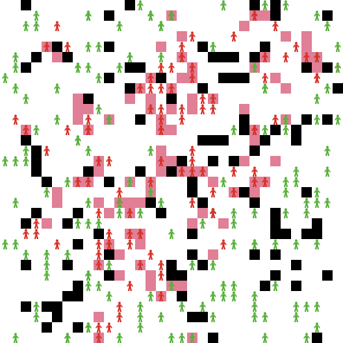 The model does not include the notion of the second opinion . Each agent can in one of two states - sick or convinced, represented by colour red and healthy or having no opinion, represented by colour white. Similarly, each patch can be contaminated (pink) or clean (white). Black patches represent obstacles and are fixed during the setup phase.
