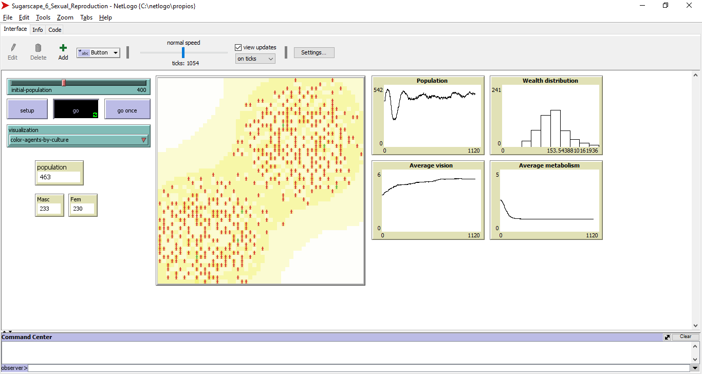 The rules are similar to Sugarscape constant grow, in adition each individual has a defined sex, that could be female or male. If an individual finds another turtle from different sex and in a reproductive age and with enough amount of sugar and the turtle is near the caller and there is an empty patch near them, then thay can offspring. Vision and metabolism are passed through generations by random chance or the vision from one parent or the metabolism from the other.