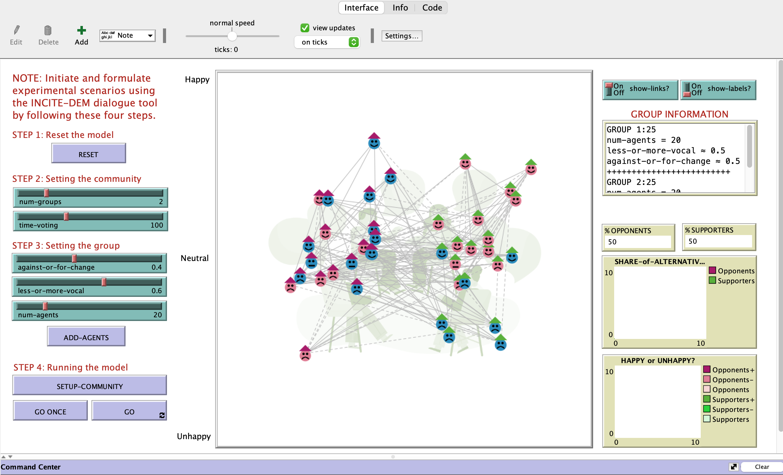 Combining "against-or-for-change", "less-or-more-vocal" and "num-agents" allows for creating for example a small outspoken group of agents that is in favour of a plan, as well as a “silent majority” that is against a plan.