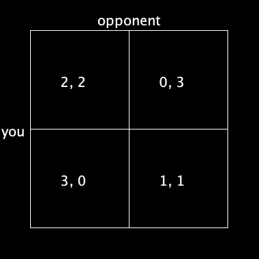 globals [ player-score opponent-score playerchoice opponentchoice game-outcome initial-play iteration unknown-strategy ]