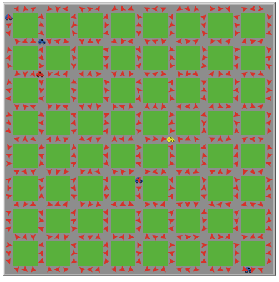 breed [cars car] breed [intersections intersection] globals [ accident-count traffic-flow-rate annual-accidents average-speed congestion-index BASE-ACCIDENTS TOTAL-VEHICLES REFERENCE-SPEED ] cars-own [ speed desired-speed waiting? trip-time ] patches-own [ is-road? ] to setup clear-all set-default-shape cars "car" set BASE-ACCIDENTS 2158 set REFERENCE-SPEED 50 setup-roads setup-intersections setup-cars set accident-count 0 set traffic-flow-rate 0 set average-speed 0 set congestion-index 0 reset-ticks end to setup-roads ask patches [ ifelse (abs pycor mod 4 = 0) or (abs pxcor mod 4 = 0) [ set is-road? true set pcolor gray ] [ set is-road? false set pcolor green ] ] end to setup-intersections ask patches [ if is-road? and any? neighbors4 with [not is-road?] [ sprout-intersections 1 [ set color red set size 1 ] ] ] end to setup-cars create-cars initial-number-of-cars [ move-to one-of patches with [is-road? and not any? cars-here] set color one-of [red blue yellow] set size 1 set speed random-float speed-limit set desired-speed speed-limit * (0.8 + random-float 0.4) set waiting? false set trip-time 0 ifelse abs xcor mod 4 = 0 [ set heading one-of [0 90] ] [ set heading one-of [90 270] ] ] end to go ; Ferma la simulazione se non ci sono più auto if count cars = 0 [ user-message "Simulazione terminata: non ci sono più auto attive." stop ] ask cars [ ifelse safe-to-move? [ move-forward check-for-accidents set trip-time trip-time + 1 ] [ set waiting? true ] ] update-statistics tick end to move-forward set waiting? false let target-speed min (list desired-speed speed-limit) let cars-ahead cars in-cone 3 20 if any? cars-ahead [ set target-speed [speed] of min-one-of cars-ahead [distance myself] ] ifelse speed < target-speed [ set speed speed + 0.1 ] [ set speed speed - 0.1 ] forward speed * 0.1 end to check-for-accidents let nearby-cars other cars in-radius 1 if any? nearby-cars [ let speed-factor (speed / REFERENCE-SPEED) ^ 2 if random-float 1 < 0.01 * speed-factor [ set accident-count accident-count + 1 die ] ] end to update-statistics ifelse count cars > 0 [ set traffic-flow-rate (count cars with [not waiting?] / count cars) * 100 set average-speed mean [speed] of cars set congestion-index 100 - traffic-flow-rate ] [ ; Se non ci sono auto, imposta valori di default set traffic-flow-rate 0 set average-speed 0 set congestion-index 0 ] let time-factor max (list (ticks / (365 * 24 * 60)) 0.0001) ; evita divisione per zero let speed-impact (speed-limit / REFERENCE-SPEED) ^ 2 set annual-accidents accident-count / time-factor end to-report safe-to-move? let next-patch patch-ahead 1 if next-patch = nobody [ report false ] if not [is-road?] of next-patch [ report false ] if any? other cars-on next-patch [ report false ] if any? intersections-on next-patch [ report random 100 < 30 ] report true end to-report get-accident-projection report annual-accidents end to-report get-average-speed report average-speed end to-report get-congestion report congestion-index end