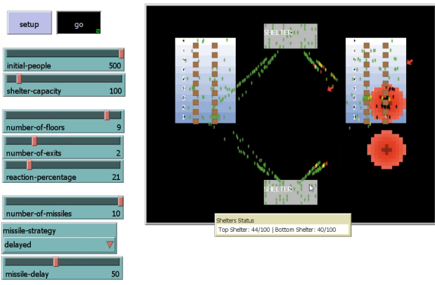 Sliders: - initial-people (0-1000): Total occupants - reaction-percentage (0-100): Percent reacting to initial alarm - shelter-capacity (0-200): Max per shelter - number-of-floors (1-10): Building height - number-of-exits (1-5): Exits per floor - number-of-missiles (1-20): Total missiles - missile-delay (10-50): Ticks between missiles (delayed strategy only)