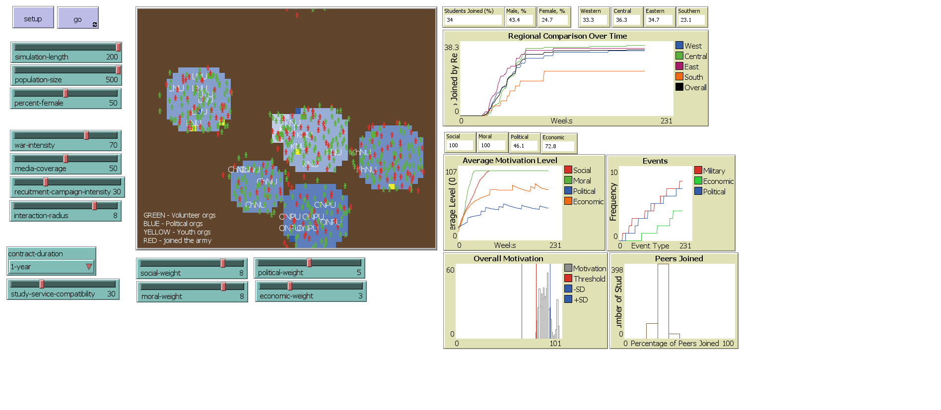 ;;;;;;;;;;;;;;;;;;;;;;;;;;;;;;;;;;;;;;;;;;;;;;;;;;;;;;;;;;;;;;; ;; STUDENT MILITARY SERVICE MOTIVATION MODEL ;; Based on research on motivations of students in Kyiv universities ;; to join military service after Russia's full-scale invasion of Ukraine ;;;;;;;;;;;;;;;;;;;;;;;;;;;;;;;;;;;;;;;;;;;;;;;;;;;;;;;;;;;;;;; ;; GLOBAL VARIABLES globals [ war-week ; Current week count since full-scale invasion media-influence ; Level of positive media coverage of military (0-100) economic-hardship ; Level of economic difficulty in the country (0-100) ;; Regional distribution percentages percent-west ; Percentage of students from Western Ukraine percent-central ; Percentage of students from Central Ukraine percent-east ; Percentage of students from Eastern Ukraine percent-south ; Percentage of students from Southern Ukraine ;; Event counters for tracking simulation events military-events ; Count of significant military events economic-events ; Count of significant economic events political-events ; Count of significant political events ] ;; AGENT DEFINITIONS breed [students student] students-own [ ;; Demographic attributes age ; Student age (17-26) gender ; Student gender ("male" or "female") study-year ; Year of study (1-4) region ; Home region ("West", "Central", "East", "South") ;; Background factors (0-100 scale) family-influence ; Level of patriotic/military influence from family educational-influence ; Level of patriotic/educational influence from school/university activism-involvement ; Level of involvement in civic/political organizations ;; Motivation types (0-100 scale) social-motivation ; Motivation from social environment and peers moral-motivation ; Moral and psychological motivation political-motivation ; Civic and political motivation economic-motivation ; Economic/financial motivation ;; Decision variables motivation-threshold ; Individual threshold required to join (varies by person) joined? ; Whether student has joined military service ;; Network variables my-organization ; Type of organization the student belongs to (if any) my-university ; University the student attends peers ; List of connected peers my-peers-joined ; Percentage of peers who have joined military ] patches-own [ university ; University identifier (name) is-organization? ; Whether patch represents an organization organization-type ; Type of organization if applicable ("youth", "political", "volunteer") ] ;; MODEL SETUP PROCEDURES to setup clear-all ;; Initialize regional distribution set percent-west 30 ; 30% of students from Western region set percent-central 40 ; 40% from Central region set percent-east 20 ; 20% from Eastern region set percent-south 10 ; 10% from Southern region set economic-hardship 80 ; Start with high economic hardship (wartime conditions) ;; Initialize event counters set military-events 0 set economic-events 0 set political-events 0 ;; Set up the model environment and agents setup-environment setup-students setup-organizations reset-ticks end ;; Sets up the physical environment (universities and spaces) to setup-environment ;; Initialize all patches to default state ask patches [ set university "none" set is-organization? false set organization-type "none" set pcolor brown - 2 ; Default background color ] ;; Create university areas on the map setup-universities end ;; Creates student agents with appropriate attributes to setup-students create-students population-size [ set shape "person" set size 1 ; Set visible size for students ;; Initialize student attributes (demographics, motivations, etc.) setup-student-attributes ;; Place student at an appropriate university let target-university one-of patches with [university != "none"] ;; Fallback if no universities exist if target-university = nobody [ move-to one-of patches ] ;; Place student at their assigned university if target-university != nobody [ set my-university [university] of target-university ;; Try to find an unoccupied patch in the university let target-patch one-of patches with [(university = [my-university] of myself) and not any? students-here] ;; If all university patches are occupied, try nearby patches if target-patch = nobody [ set target-patch one-of patches with [university = [my-university] of myself] ;; Last resort fallback if target-patch = nobody [ set target-patch one-of patches ] ] ;; Move to the selected patch move-to target-patch ;; Add small random movement to avoid perfect alignment fd random-float 2 ] ] end ;; Initialize individual student attributes based on research data to setup-student-attributes ;; Set demographic attributes set age 17 + random 10 ; Ages 17-26 (typical university age range) set gender ifelse-value (random 100 < percent-female) ["female"] ["male"] set study-year 1 + random 4 ; Years 1-4 of university ;; Set regional background with appropriate probabilities let random-num random 100 if random-num < percent-west [set region "West"] if random-num >= percent-west and random-num < (percent-west + percent-central) [set region "Central"] if random-num >= (percent-west + percent-central) and random-num < (percent-west + percent-central + percent-east) [set region "East"] if random-num >= (percent-west + percent-central + percent-east) [set region "South"] ;; Initialize influence factors based partly on region set family-influence setup-family-influence set educational-influence setup-educational-influence set activism-involvement 0 ; Will be updated when organizations form ;; Initialize motivation factors with gender differences based on research ifelse gender = "female" [ ;; Female students - research shows higher moral components set social-motivation random 30 + 5 set moral-motivation random 30 + 10 set political-motivation random 30 set economic-motivation random 30 - 5 ] [ ;; Male students set social-motivation random 30 set moral-motivation random 30 set political-motivation random 30 + 5 set economic-motivation random 30 ] ;; Set individual threshold (varies by person and gender) ifelse gender