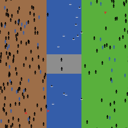 The world is divided into three zones: Sicily (brown patch), sea (blue patch) and Mainland (green patch). Followers have goals assigned (Each follower chooses one of the patches within zone Sicily and keeps this variable as "possible-goal". It checks whether it found this kind of patch, if there are no possible patches on Sicily, it returns "nobody": "if possible-goal != nobody). Each follower at the beginning has 0 sea-crossings (boolean has-crossed-sea? is fixed on false). Once it crosses the sea, it changes the color to blue to show that it has successfully crossed from one region to another. The sea-crossings count increases the global variable crossed-followers that is crucial for construction of the bridge between regions. Once this number reaches the flexible threshold "min-crossings", the bridge is built. It appears as gray patches and its length is determined by "bridge_length". By default the popularity is being determined for each region, Sicily is more popular than Mainland, so there will always be more followers going to Sicily than to the other region.