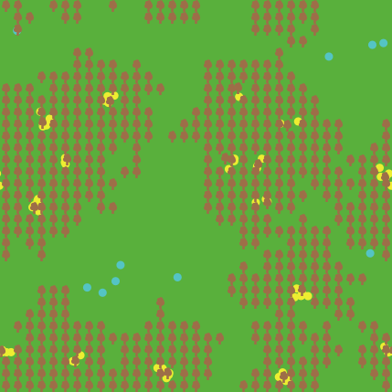 ; Simulación multiescalar en CGSM (Ciénaga Grande de Santa Marta) ; Fase Micro → Meso → Macro con continuidad ecológica y relacional entre agentes ; Información basada en ecología real de bacterias del suelo, manglares e impacto de herbívoros breed [bacterias bacteria] breed [mangles mangle] breed [iguanas iguana] patches-own [nutrientes] mangles-own [salud expansion] bacterias-own [simbiotica] ; ========== SETUP GENERAL ========== to setup clear-all ask patches [ set pcolor green set nutrientes random 10 ] set-default-shape bacterias "circle" set-default-shape mangles "tree" set-default-shape iguanas "turtle" create-mangles 15 [ setxy random-xcor random-ycor set color brown set salud 5 set expansion 1 ] create-bacterias 80 [ setxy random-xcor random-ycor set color cyan set size 0.7 set simbiotica false ] reset-ticks repeat 500 [ go ] end ; ========== GO GENERAL ========== to go if ticks < 50 [fase-micro] if ticks >= 50 and ticks < 150 [fase-meso] if ticks >= 150 [fase-macro] tick end ; ========== FASE MICRO: Simbiosis ========== to fase-micro ask bacterias [ let objetivo one-of mangles in-radius 6 if objetivo != nobody and simbiotica = false [ face objetivo rt random 10 - random 10 fd 1.5 if distance objetivo < 1 [ set color yellow set simbiotica true ask objetivo [ set salud salud + 1 ] ] ] ] end ; ========== FASE MESO: Expansión vegetal ========== to fase-meso ask mangles [ if salud > 6 [ set expansion expansion + 0.03 ] let nearby-patch one-of patches in-radius expansion if nearby-patch != nobody and not any? mangles-on nearby-patch [ ask nearby-patch [ sprout 1 [ set breed mangles set color brown set salud 5 set expansion 1 ] ] ] ] end ; ========== FASE MACRO: Herbivoría de iguanas ========== to fase-macro if ticks = 150 [ create-iguanas 10 [ setxy random-xcor random-ycor set color lime ] ] ask iguanas [ let objetivo one-of mangles in-radius 2 if objetivo != nobody [ face objetivo fd 1 ask objetivo [ set salud salud - 1 if salud <= 0 [ die ] ] ] ] end
