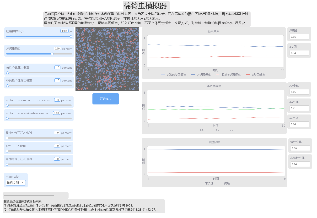 Clicking the "Run simulation" button initializes the world with a population of organisms of the selected species, with the specified allele frequencies. It will then start the population in motion and will run for 99 generations.